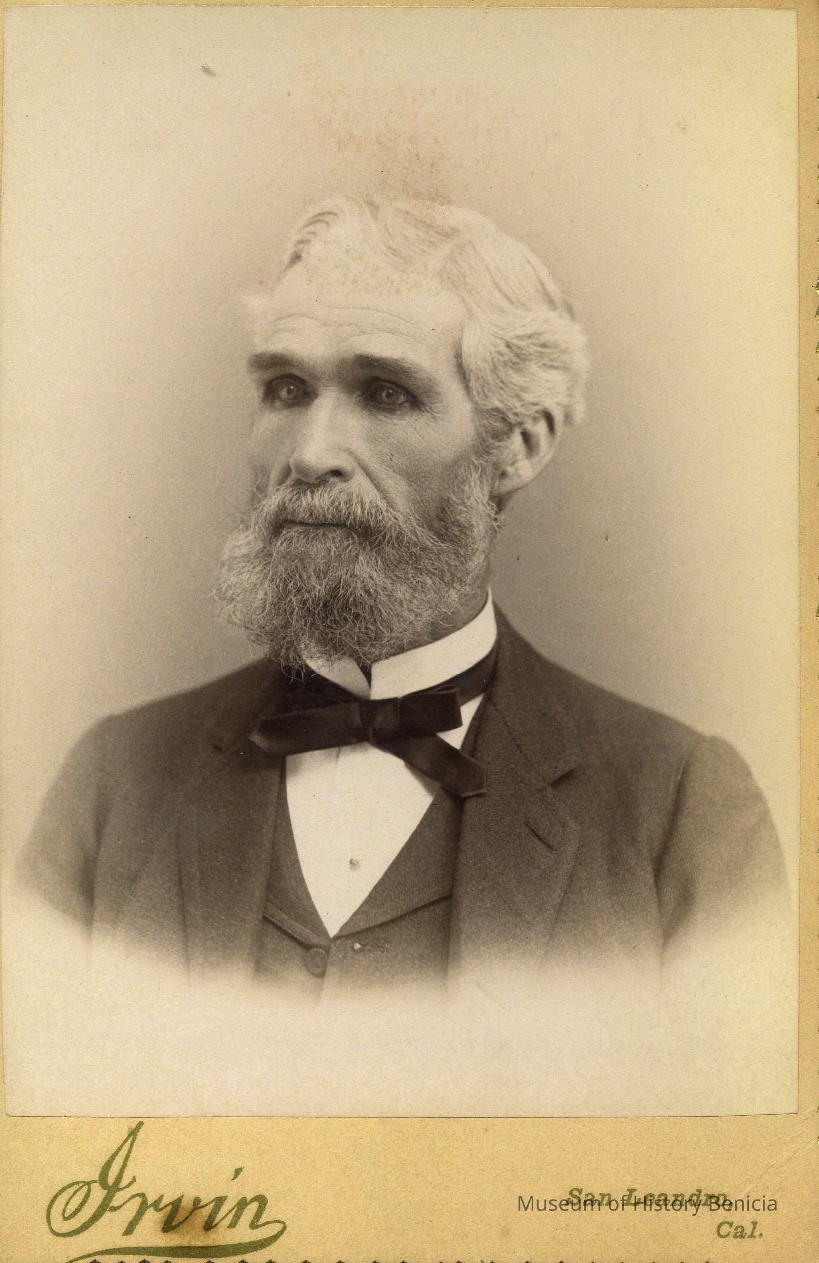 B/W photograph glued on 6-1/2" x 4-1/4" cardboard of an unidentified older man with a beard; 4" x 5-5/8"; at bottom on front: "Irvin" "San Leandro, Cal"