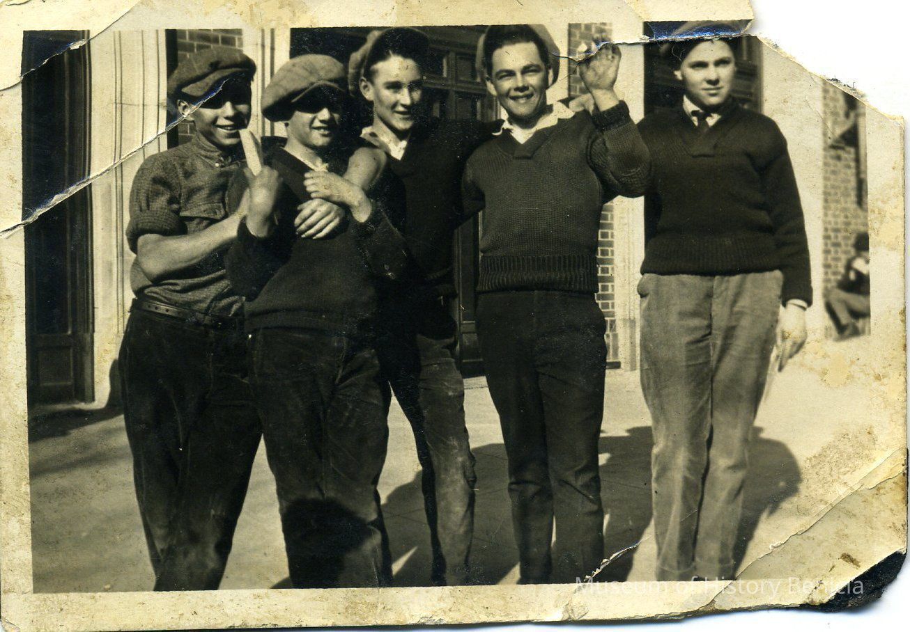 B/W photograph of an unidentified group of five young men; clothing suggests early 1900's;