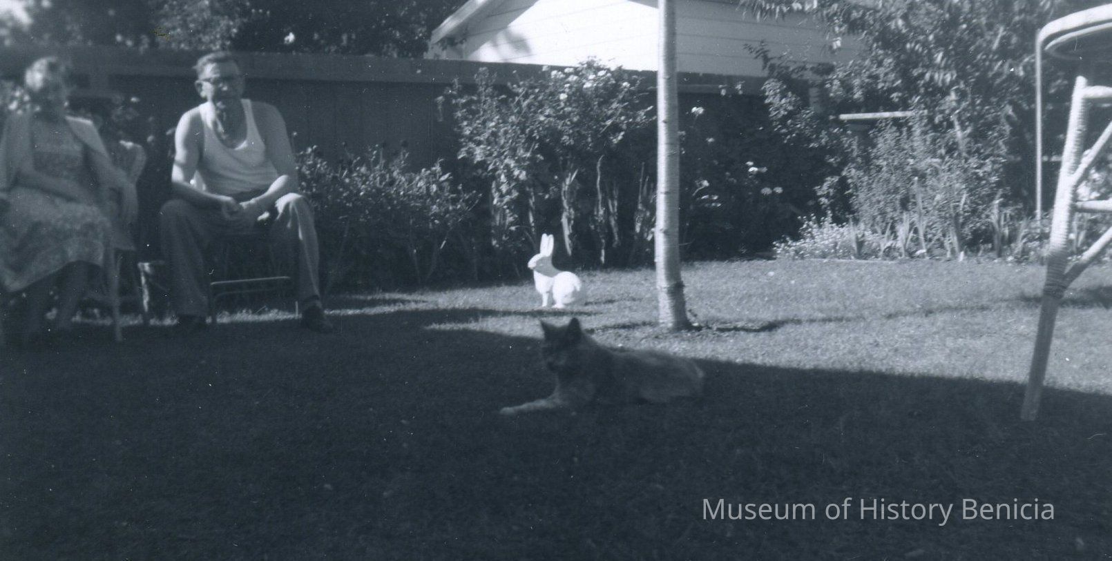 B/W photograph of two unidentified people in a backyard with a rabbit garden piece and a cat at an unknown location;