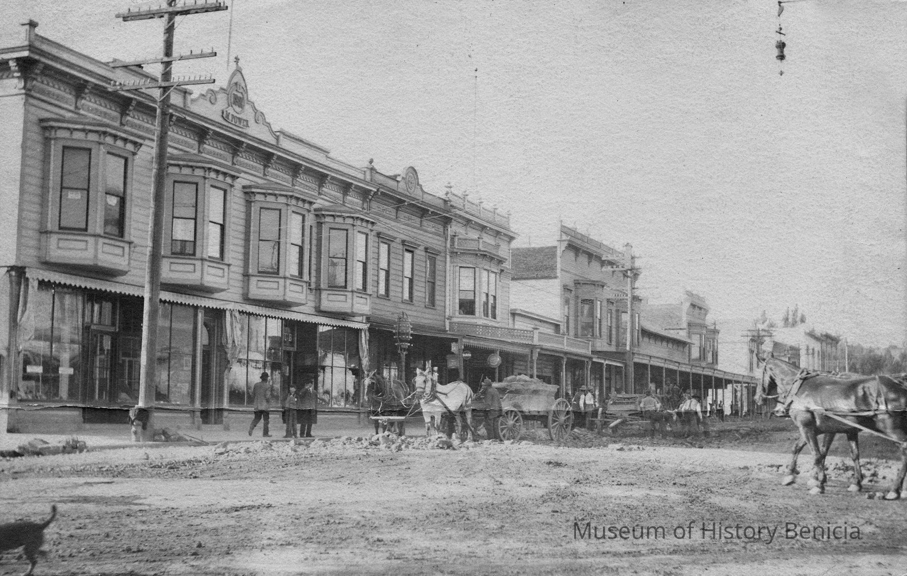 B/W Photograph - activity on First Street Benicia in the horse-drawn vehicle/unpaved streets era
