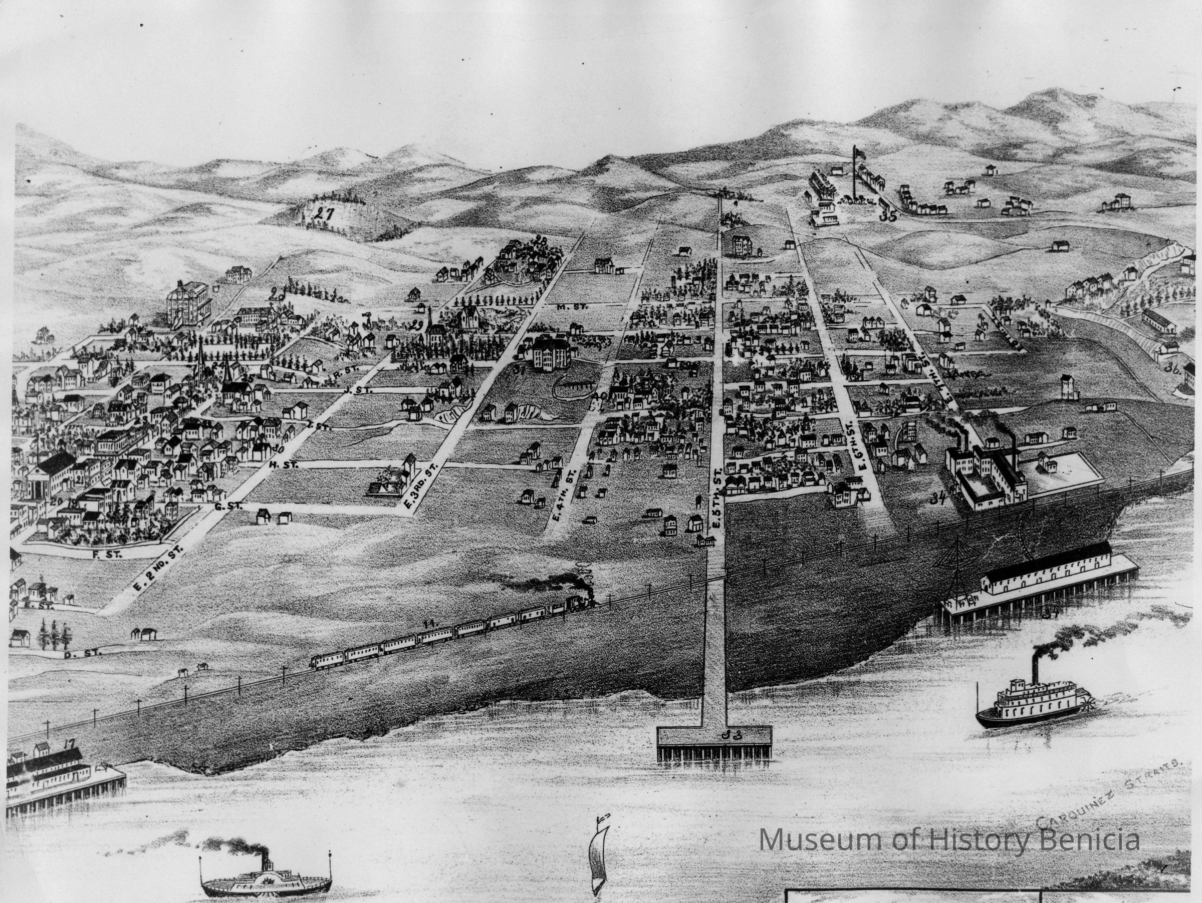 B/W Photograph - of an early lithograph of a map of the City of Benicia focused on East 5th Street - shows industry on the eastside and buildings in the ArsenalCollection
