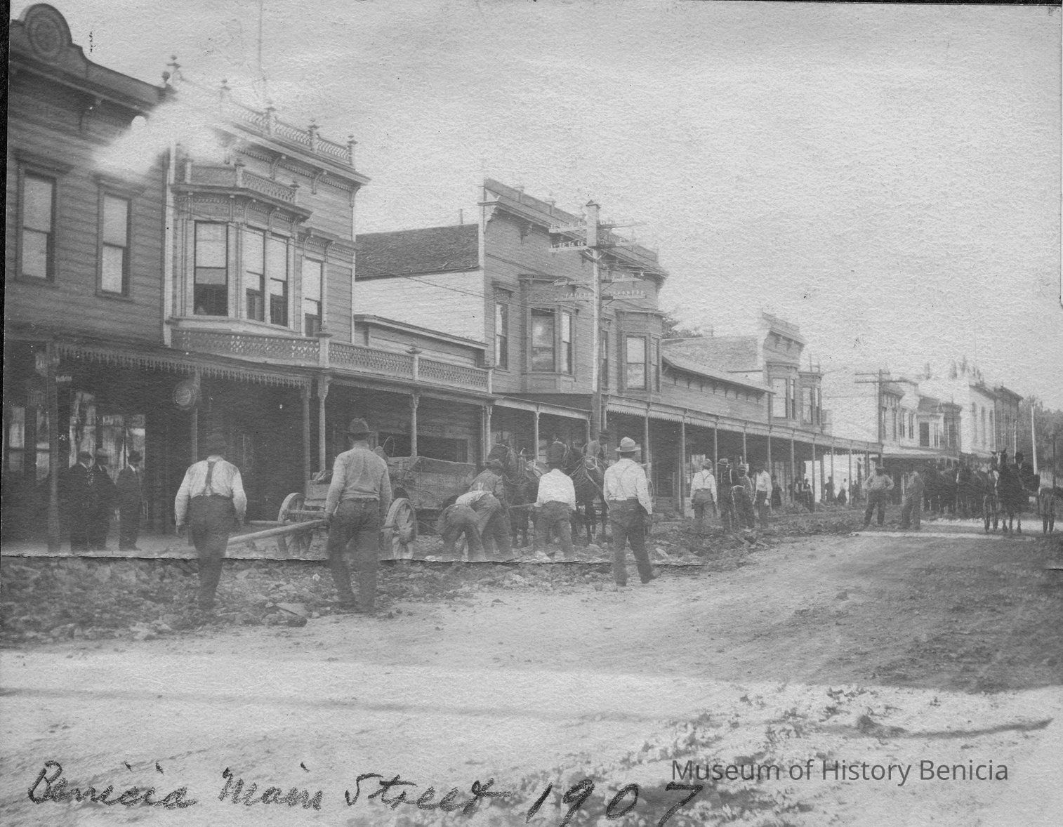 B/W Photograph - activity on First Street Benicia in the horse-drawn vehicle/unpaved streets era; bottom of photo: "Benicia Main Street 1907"Collection