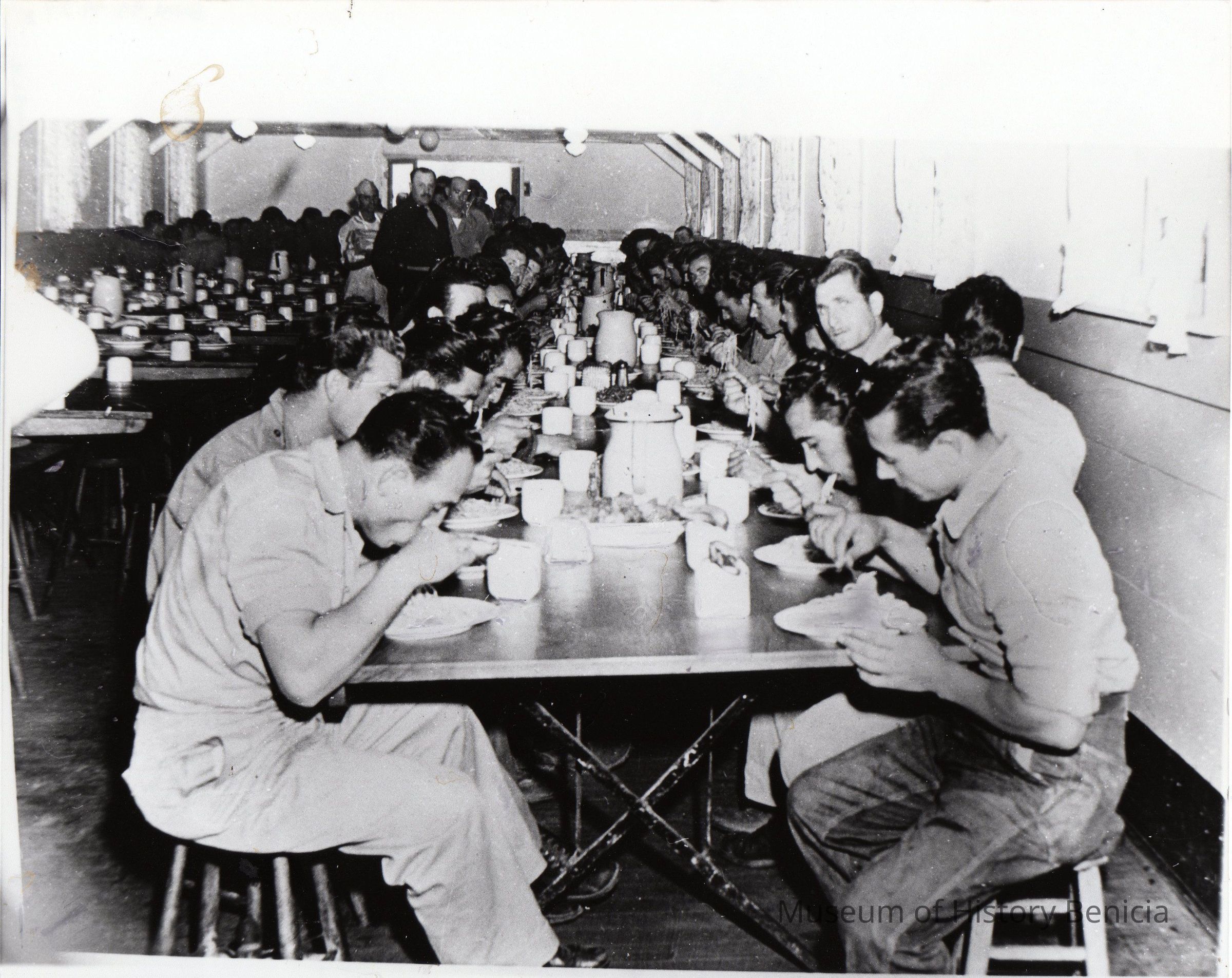 Reprints of photograph of Italian prisoner of war service unit WWII 1944-46; mess hall, including spaghetti.
