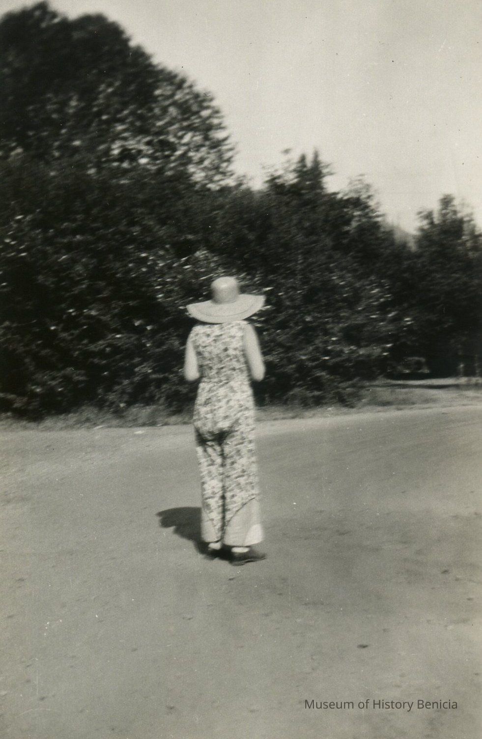 B/W Photograph - a young woman in a hat, from behind at an unknown location; 3" x 4-3/4"; [From the Rankin Collection]