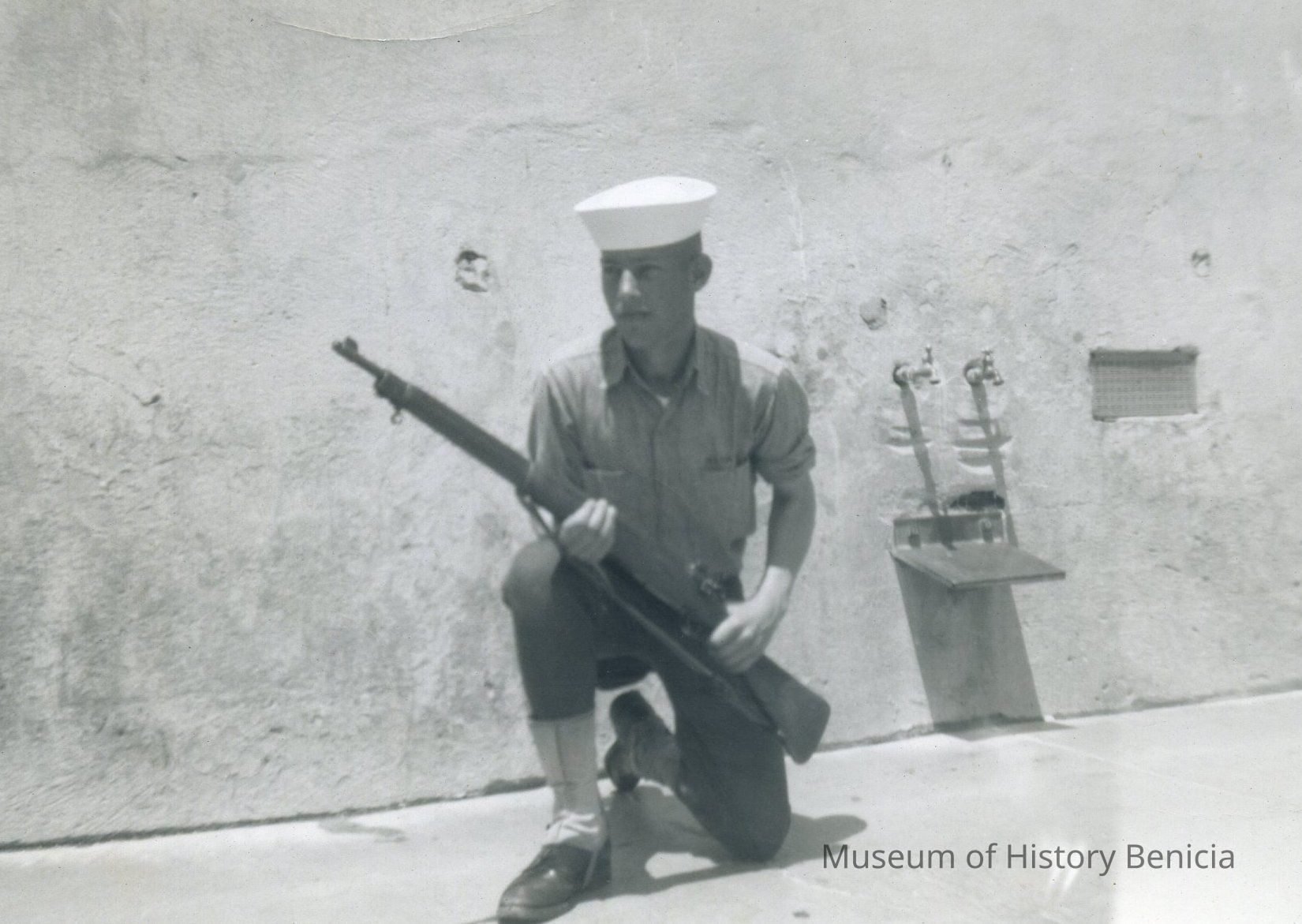 B/W Photograph - Ed Rankin posing with a weapon at the U.S. Navy Recruit Training Center in San Diego CA March 1963 3-1/2" x 5"