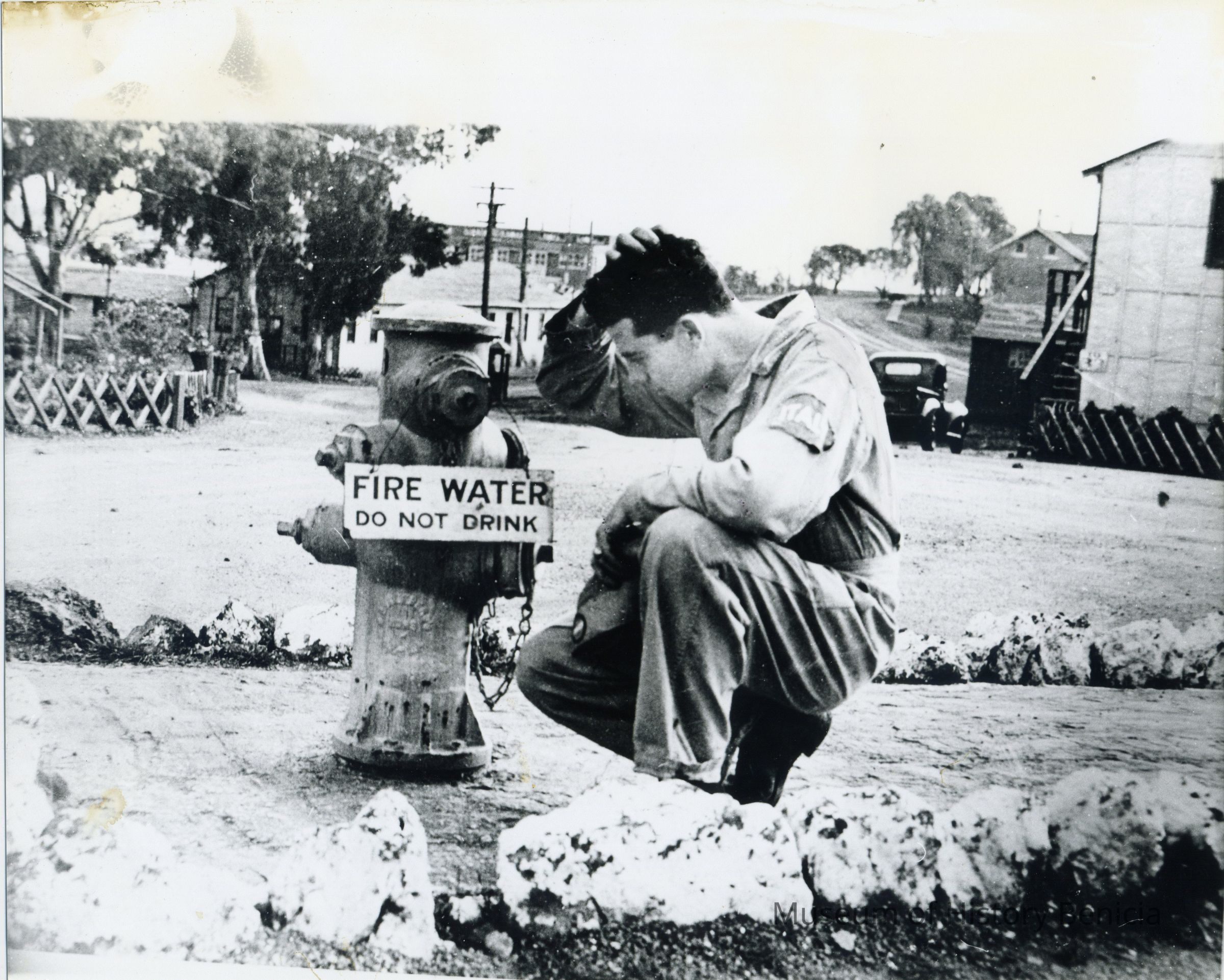 Reprints of photographs of Italian prisoner of war service unit WWII 1944-46; unidentified soldier contemplating machine of "fire water".