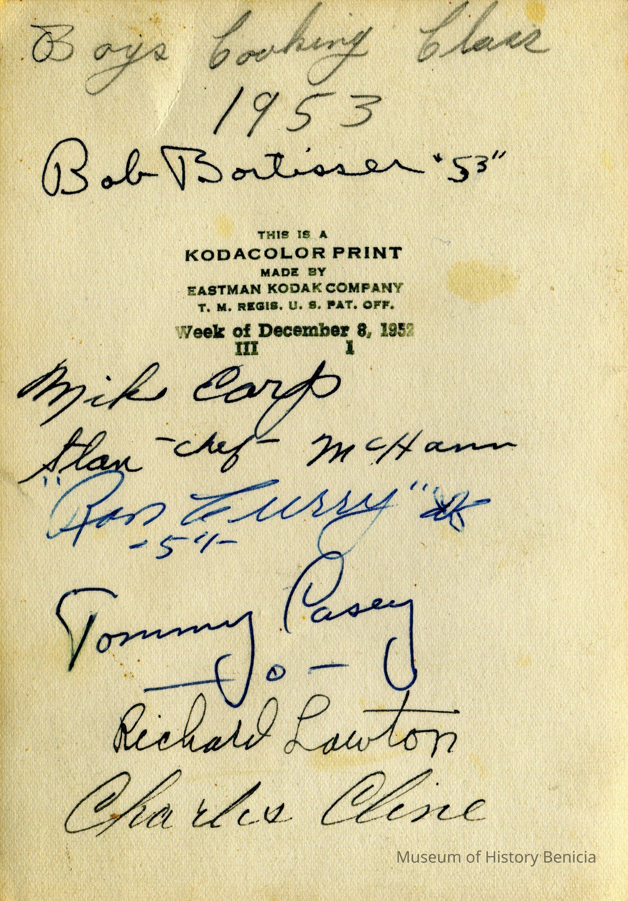 This is a photo of a boys cooking class in 1953. Names on the back are: