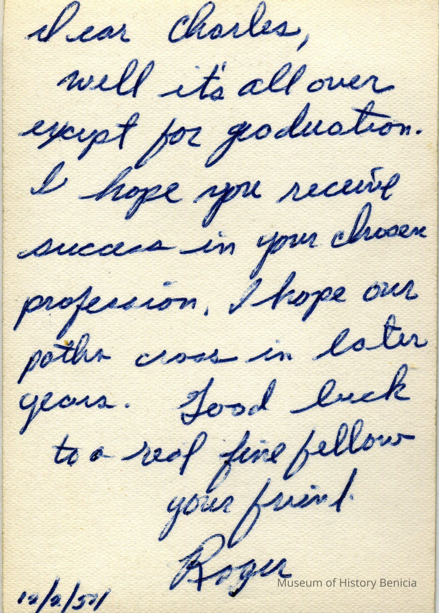 This is a Benicia high school senior graduation photo of a boy named Roger Tiffany. The back is addressed to Charlie. They were in the Class of 1955.Collection