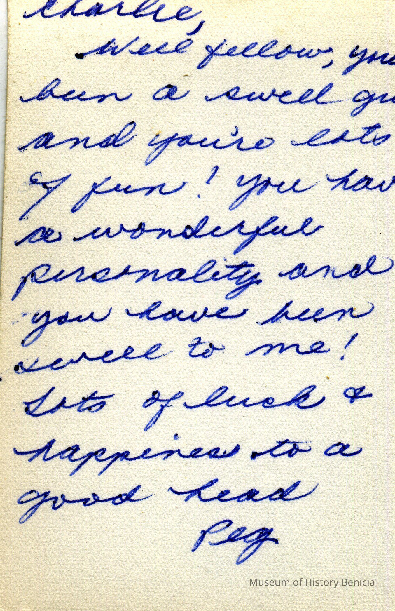 This is a Benicia high school senior graduation photo of a girl named Margaret "Peg" Rust. The back is addressed to Charlie. They were in the Class of 1955.Collection