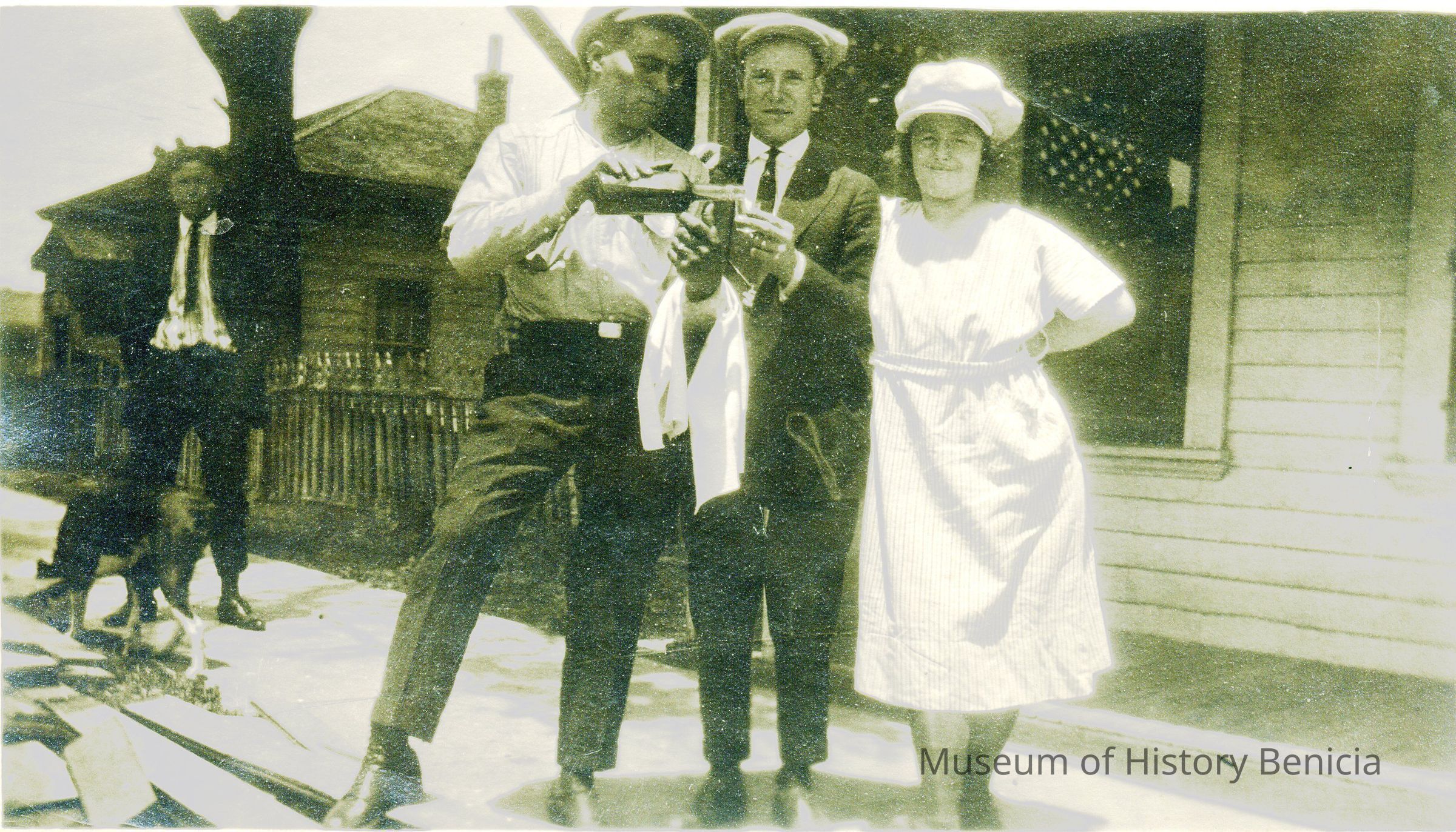 This is a photo of a two men and a woman on the sidewalk. They appear to be pouring drinks. The attire looks like 1920s. Maybe this has to do with the end of prohibition.Collection