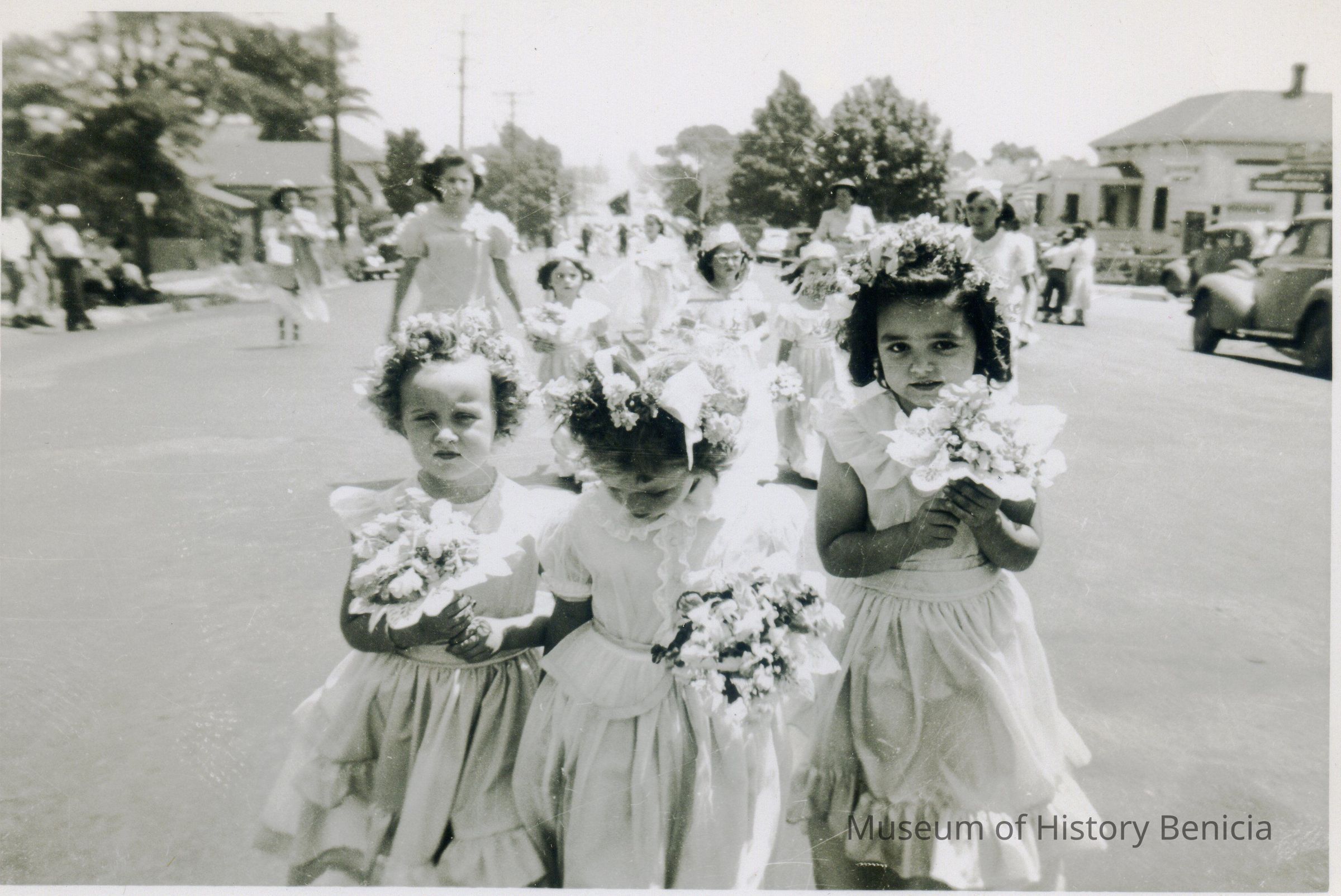 This is a photo of girls in frilly dresses with flowers in a parade down the street. They are walking on East H Street quite possibly in the Holy Ghost celebration parade. The girl at the left could be Lois Ann Sheetz and the girl at the right could be Mary Ann Serpas.Collection