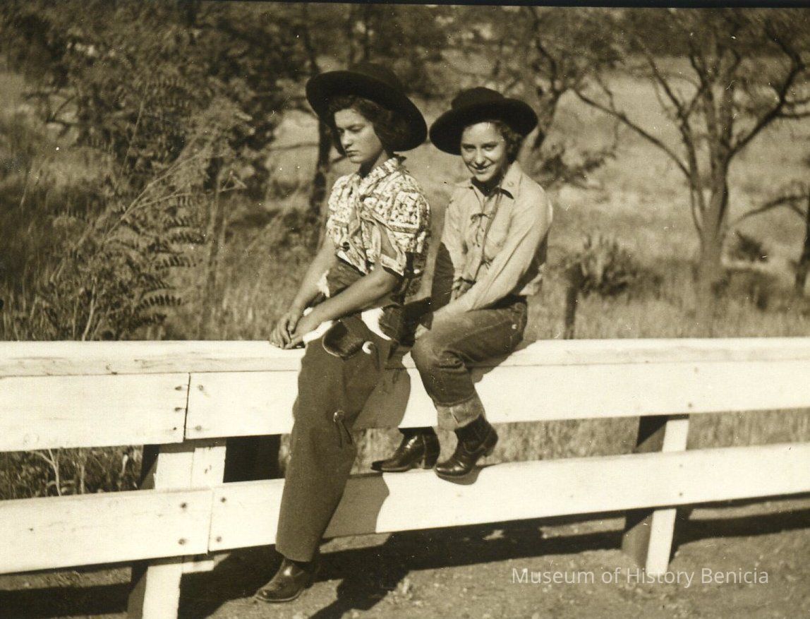 B/W Photograph - Two young women dressed in western clothes; Babe Correira (left) and Vilma Lewis (right); they would probably be riding in a parade like the "Old Timers".