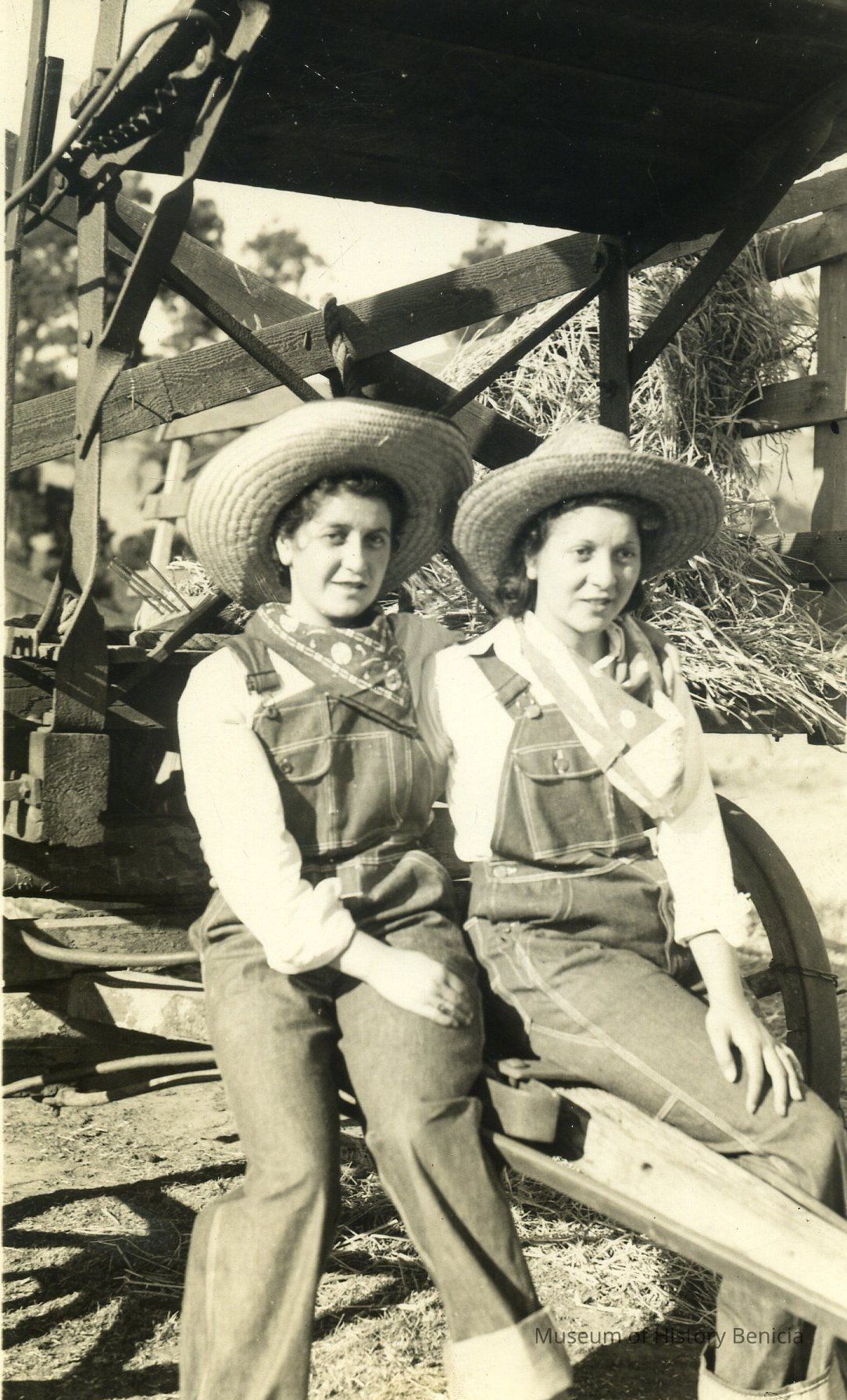 B/W Photograph - Two young women dressed in overalls, perhaps for a city celebration and/or parade. 3" x 5"