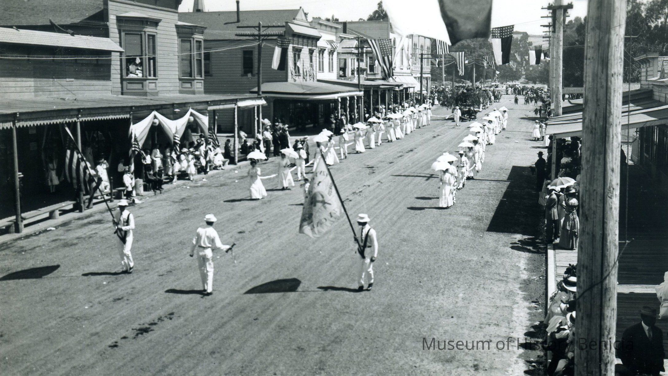 B/W Photograph - Parade in Benicia, First Street circa 1910; "Frank Stumm Photo" stamped on the back 3-1/2" x 5-7/8"