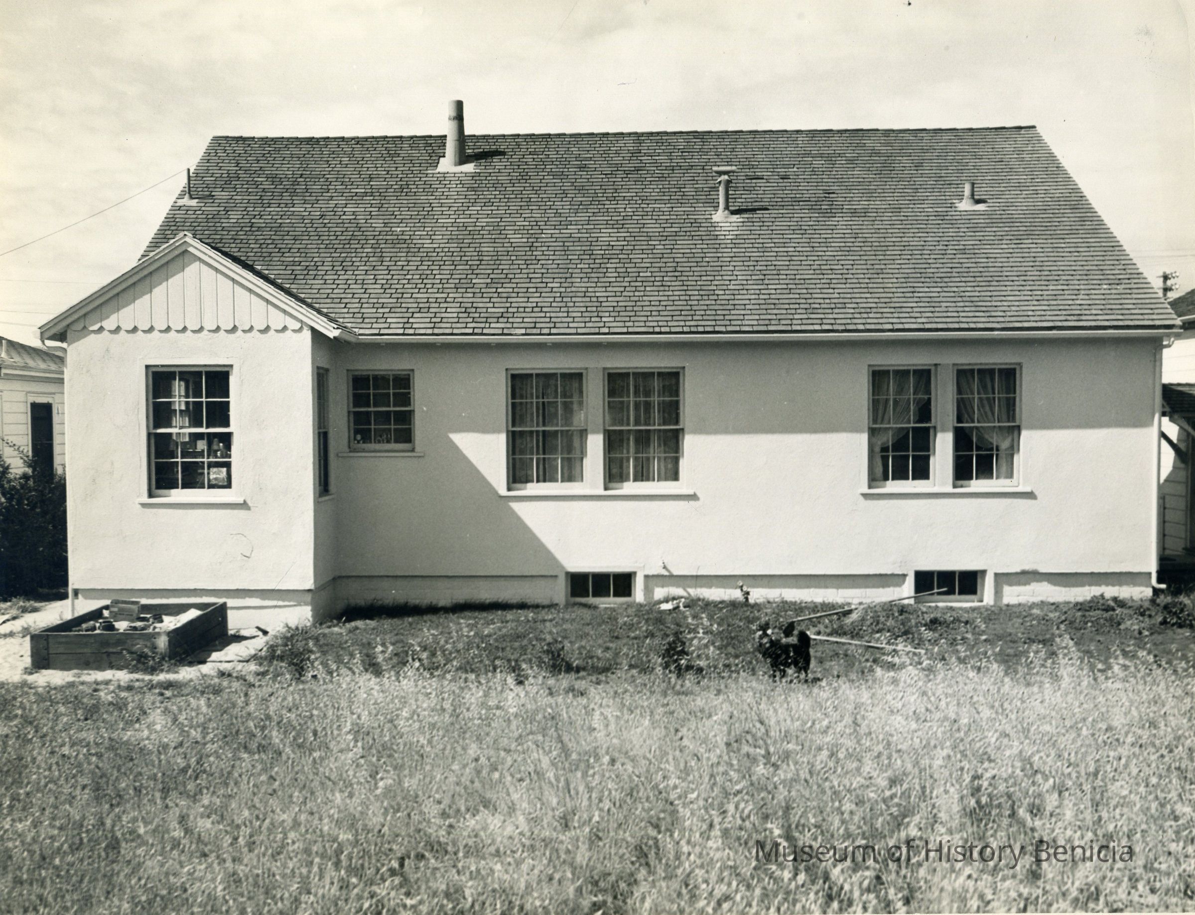 B/W Photograph - Rear view of 301 East L Street, Benicia CA, dated prior to 1951, before backyard landscaping. It is the home of the Habegers with Steve Habeger's sand box. The dog in the photo is Steve's dog named Theodore after Ted Culver who owned the hardware store. Theodore was killed by an Army truck in 1951.