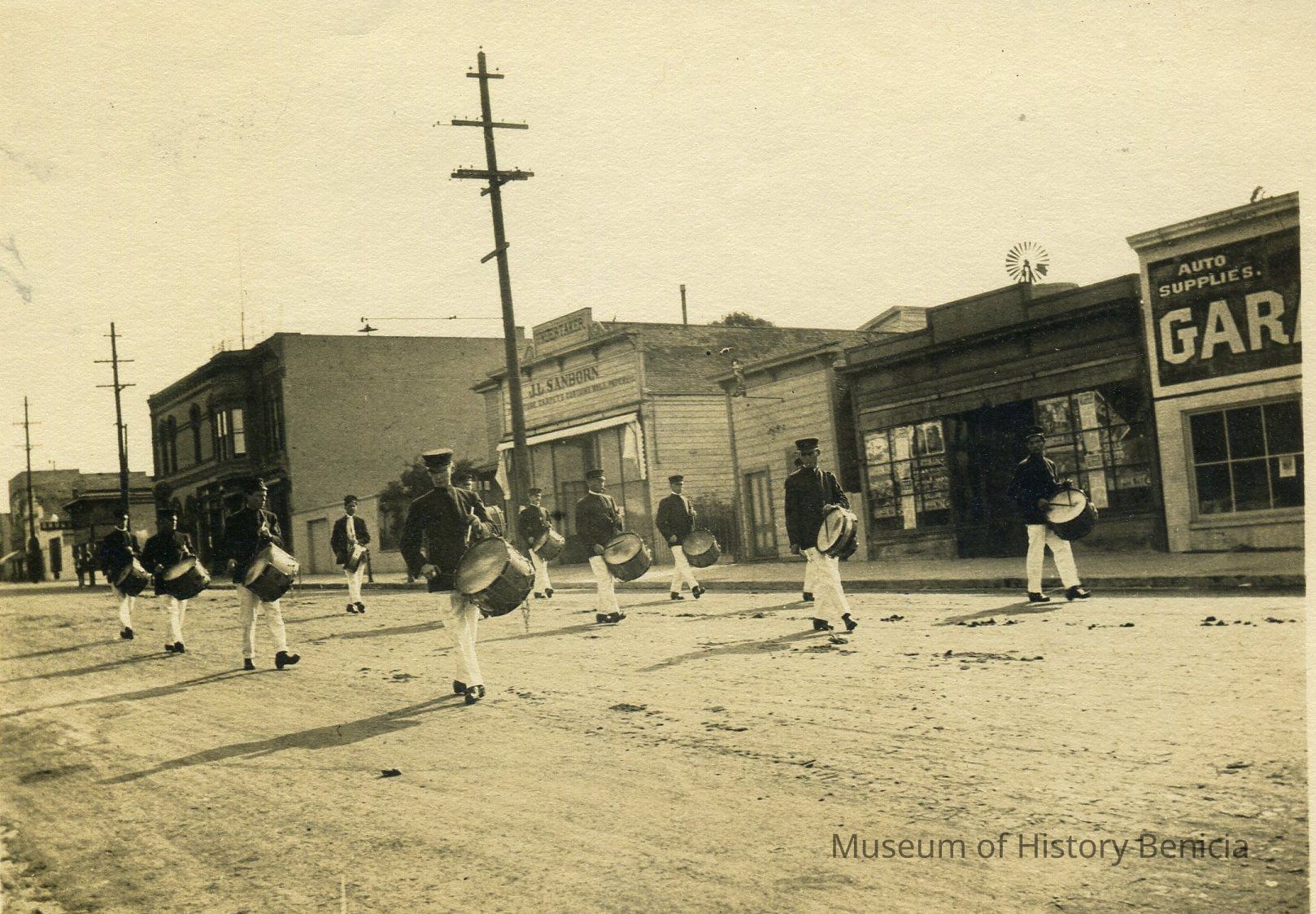B/W Photograph - Drum group marching on First Street between G & H Streets in Benicia; Vinyes Council No. 16 of the Benicia chapter of the Young Men's Institute. 3-1/2" x 4-3/8"