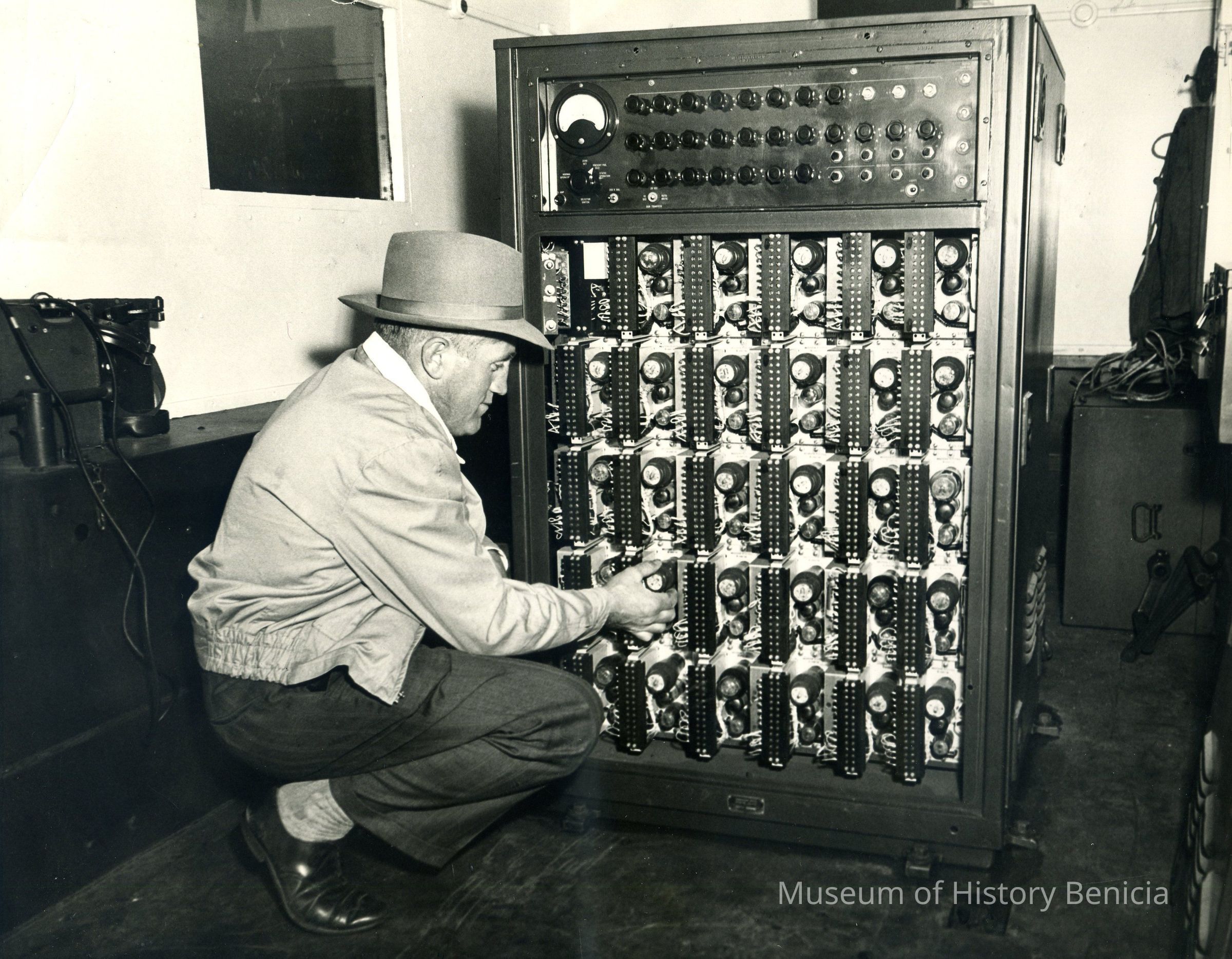 B/W Photograph - Richard Habeger adjusting an early computer at Benicia Arsenal. 8" x 10"