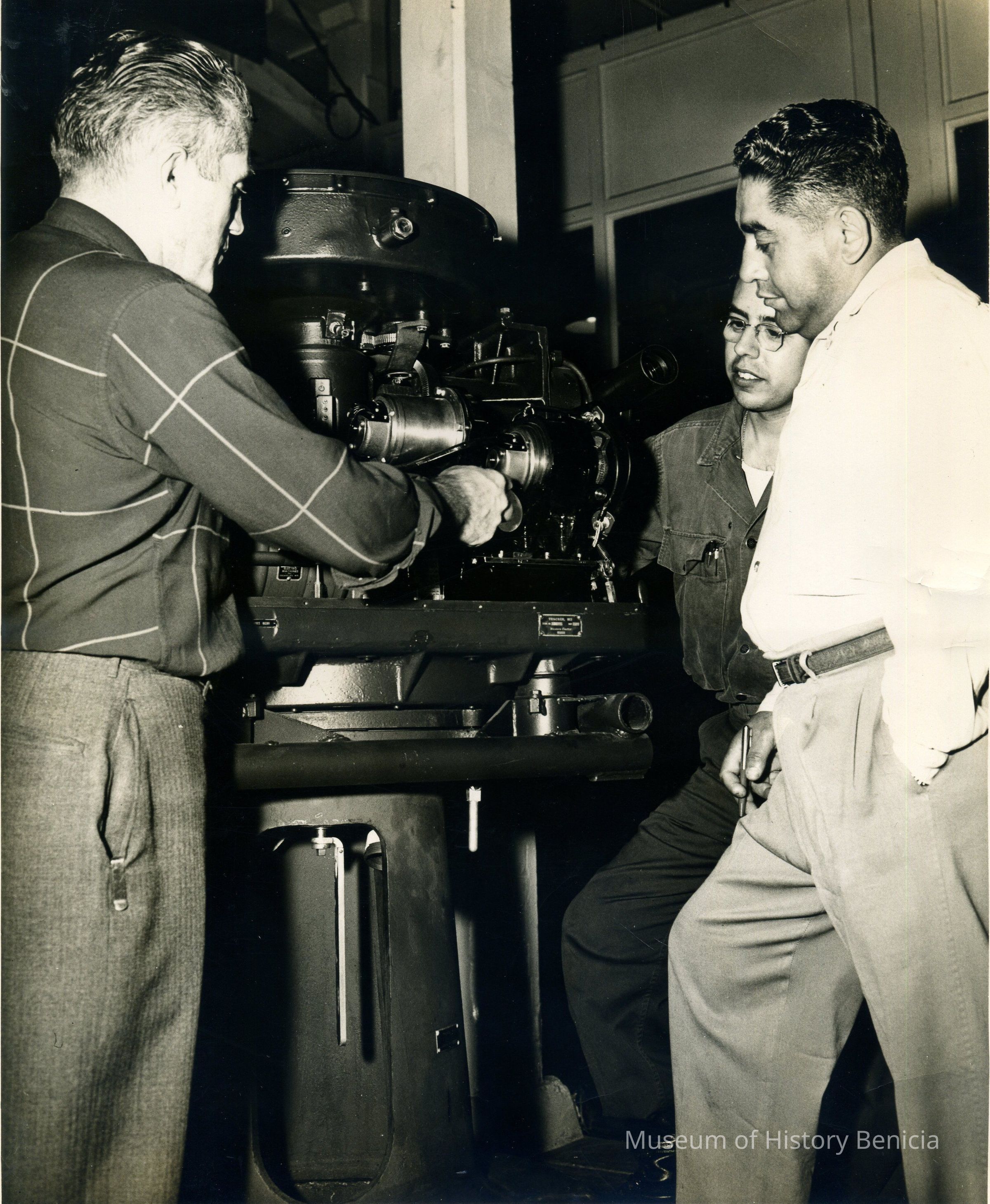 B/W Photograph - Mr. Richard Habeger gives pointers to Alexander Campas and Henry Sanchez in regards to a tracker for anti-aircraft guns at a Benicia Arsenal Fire Control School class in the early 1950's 8" x 10"Collection