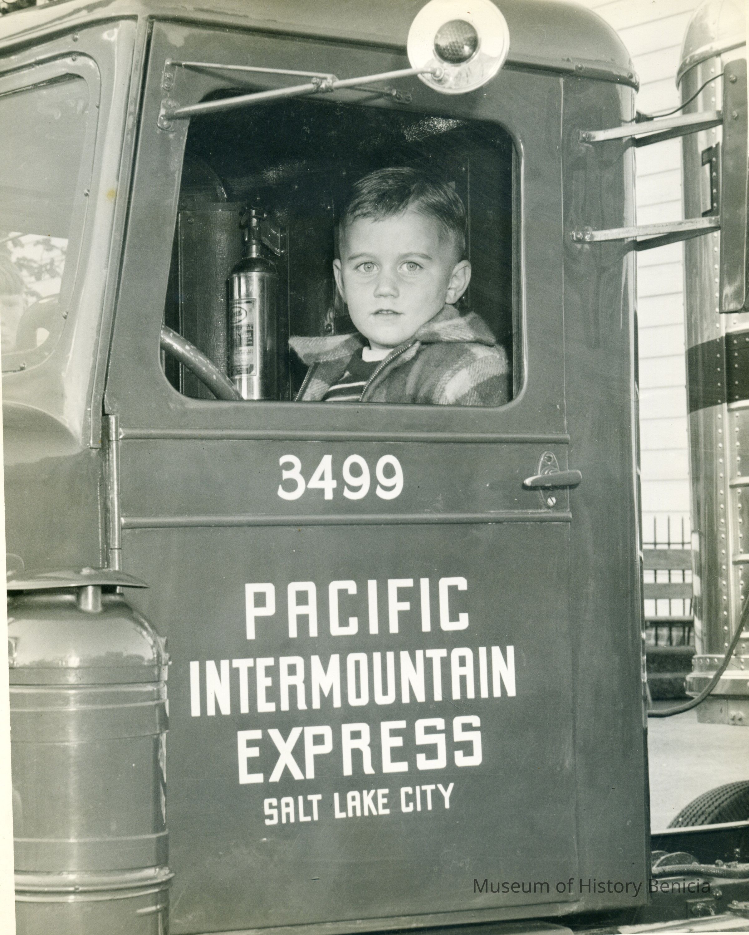 B/W Photograph - Steven Habeger in a sub-scale Pacific Intermountain Express (P.I.E.) truck in 1955.
