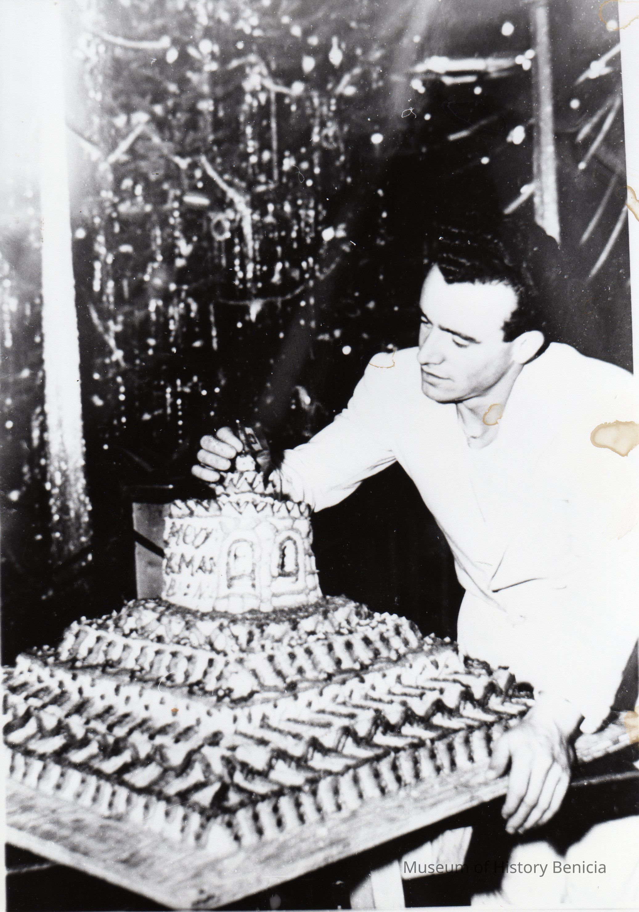 Reprints of photograph of Italian prisoner of war service unit WWII 1944-46; unidentified cook w/ Christmas cake. Black and white photo.