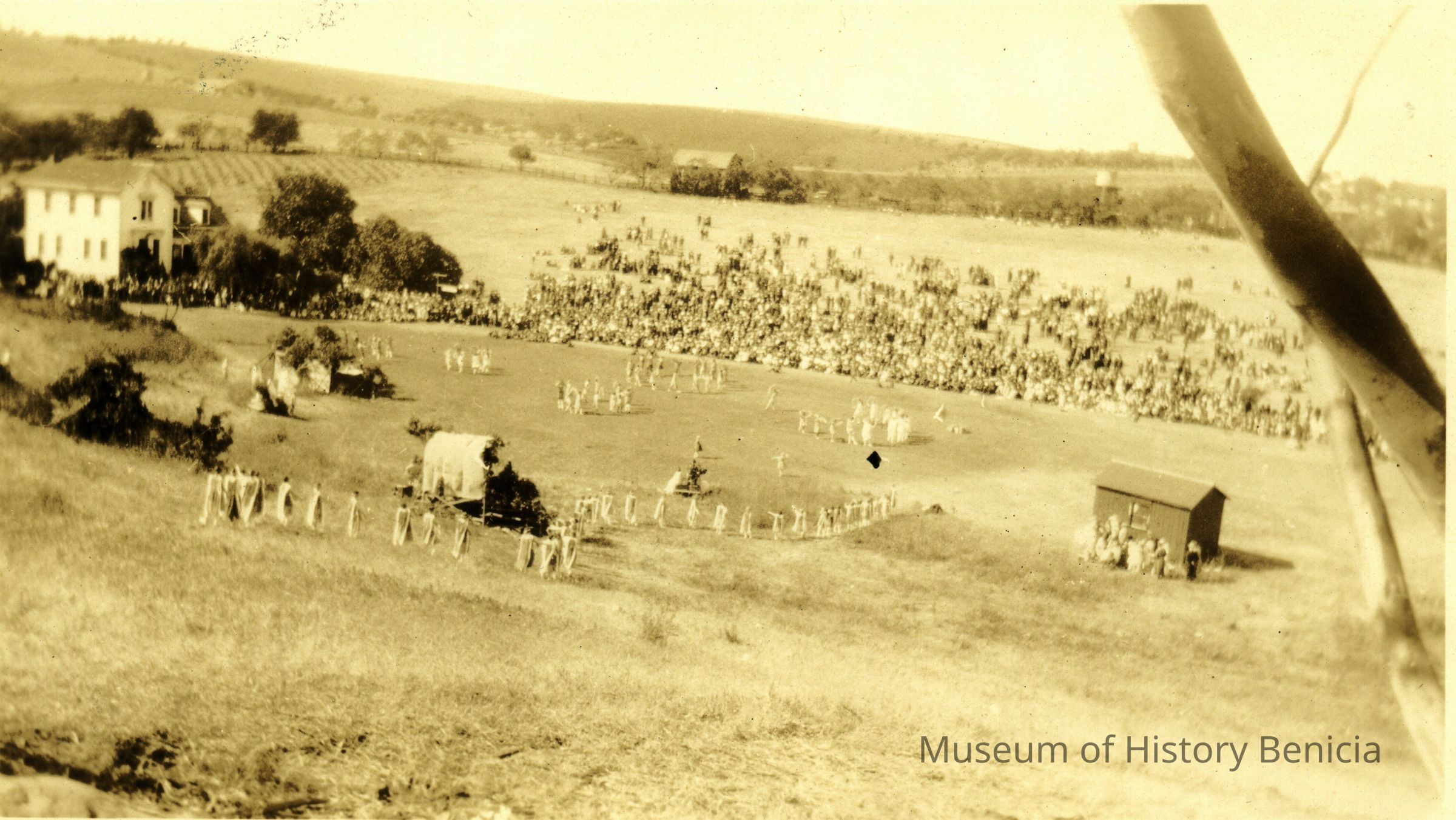 This is a photo of the 1923 Solano Pageant. It was held on the Pometta's ranch and involved all of the cities in Solano County.