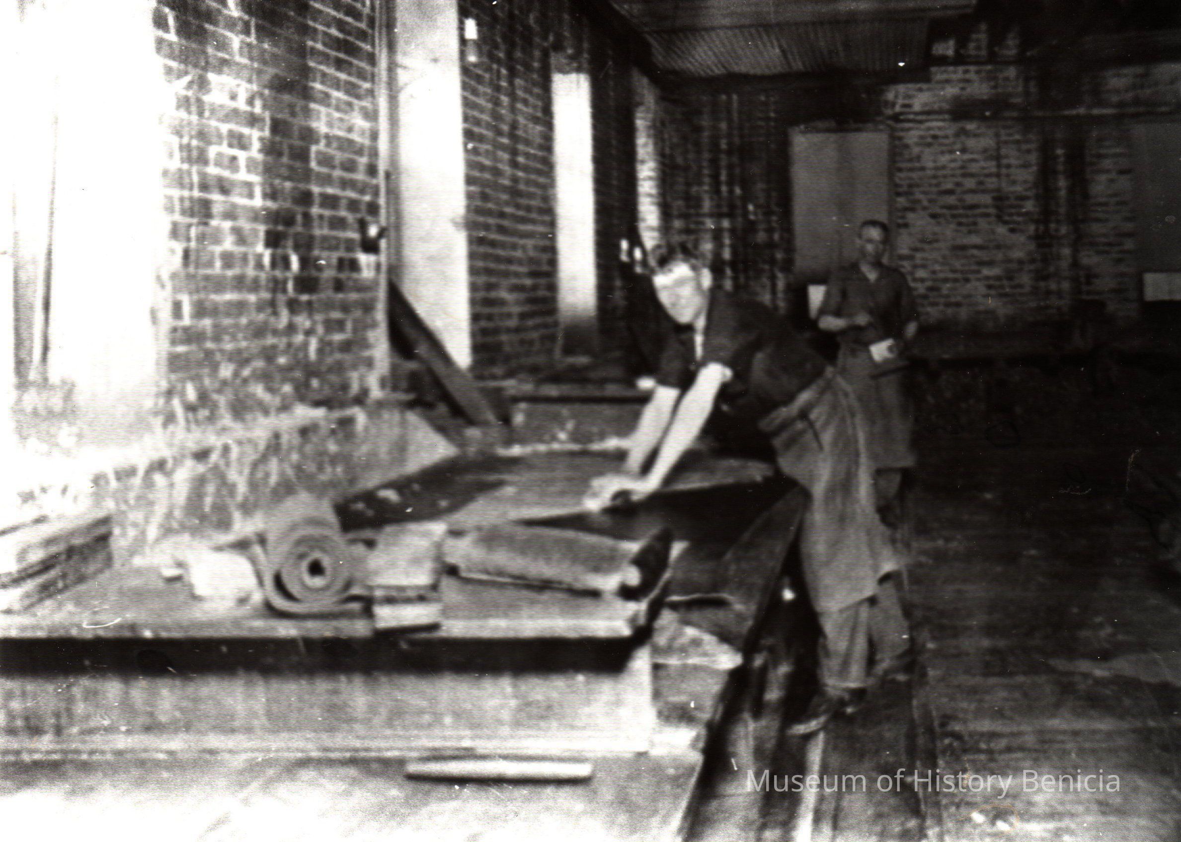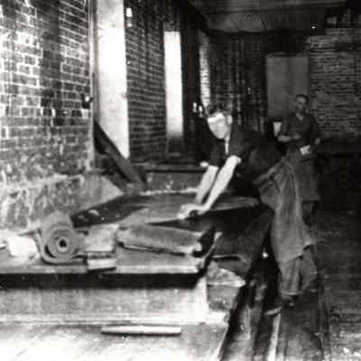 Sepia-tone photograph from an album: Final scrapings of tanned hides at the Kullman Salz Tannery.