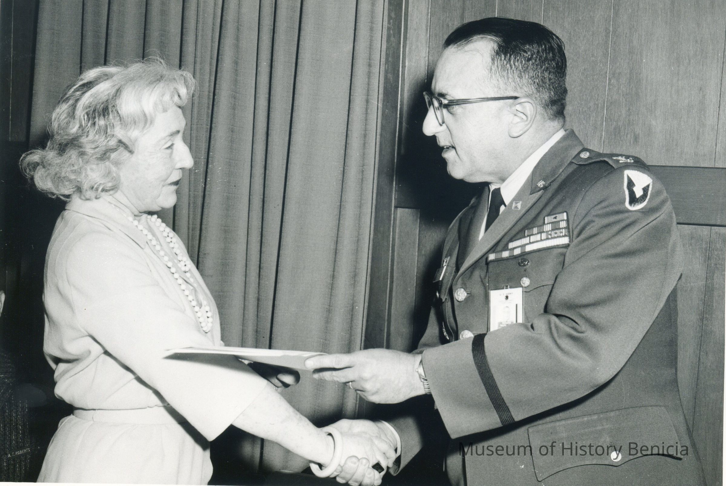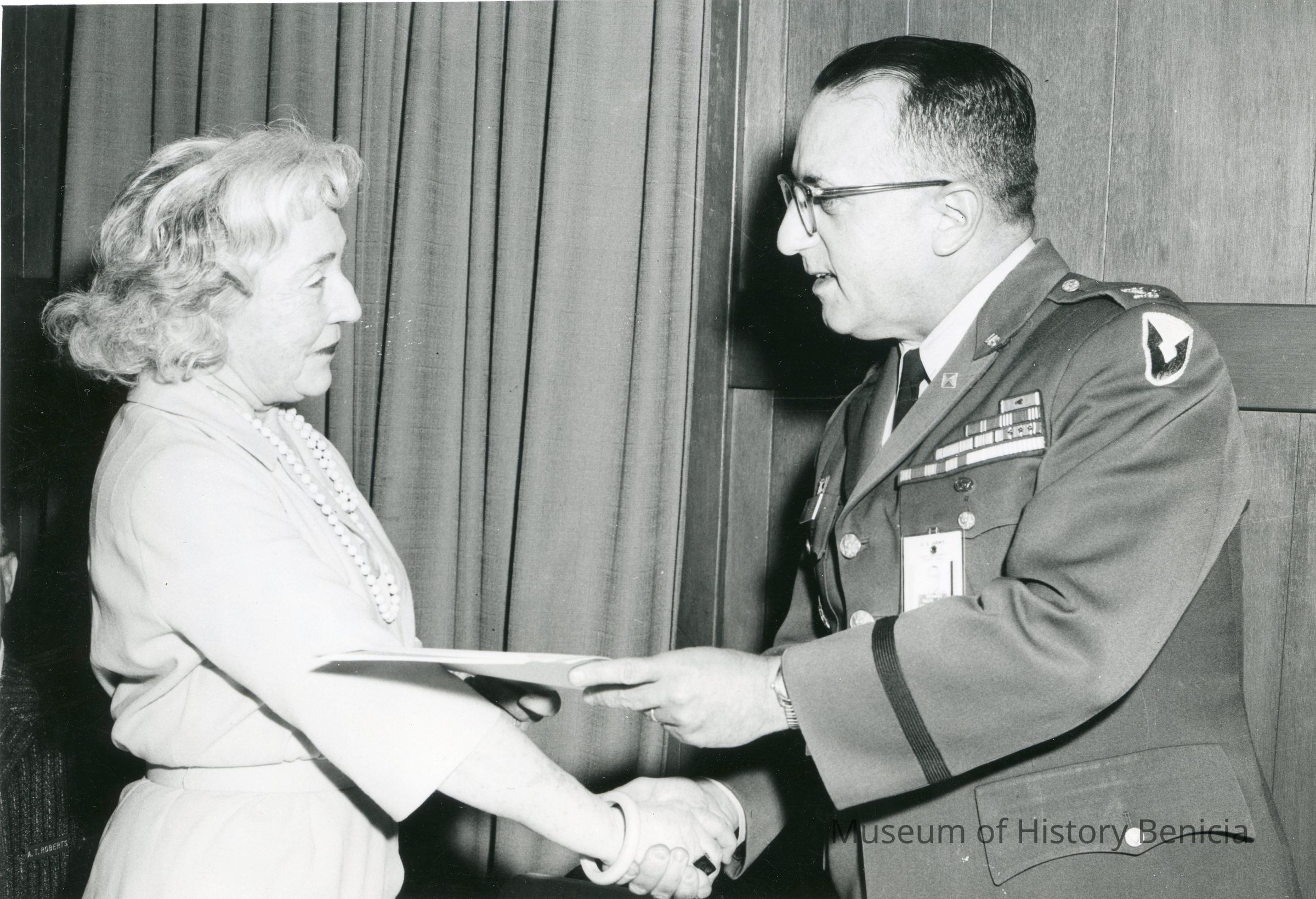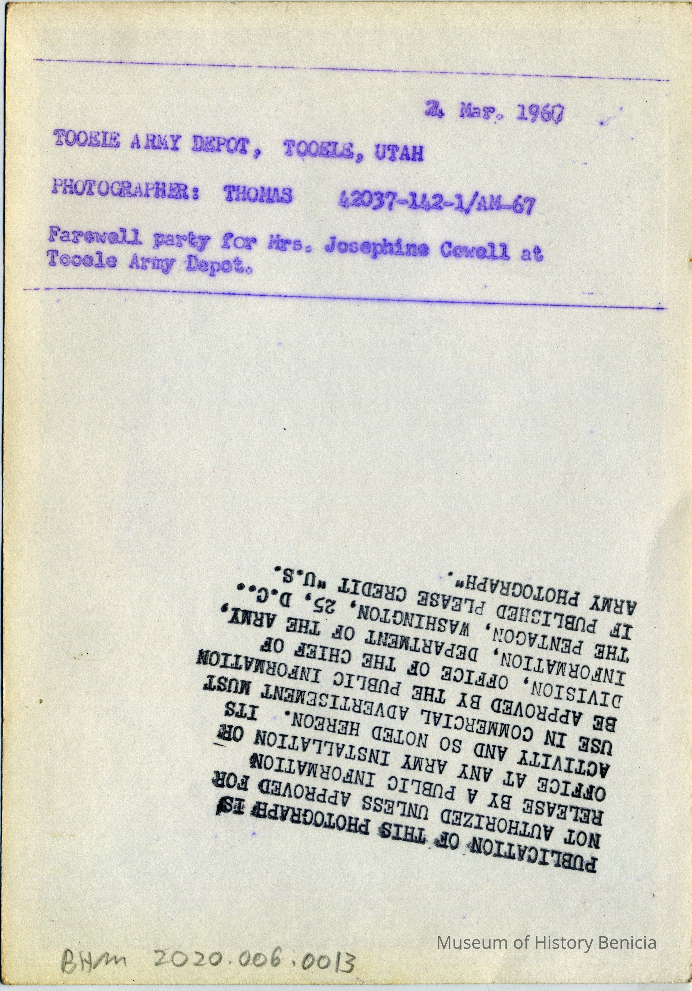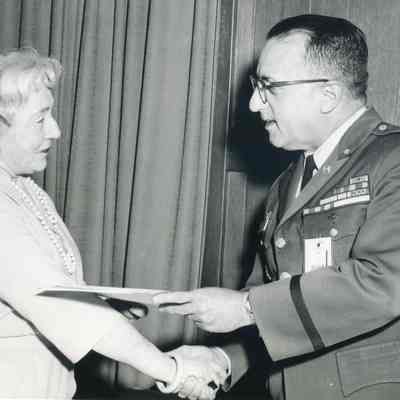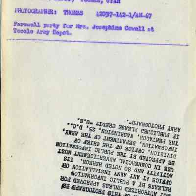 This is a photograph of Josephine Cowell receiving papers at Tooele Army Depot. This was her farewell party.