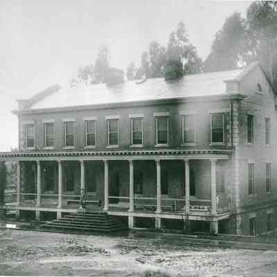 This is probably an early photograph of the Barracks enlisted men (building 45). It was built in 1872. There is a soldier in what looks to be a WWI vintage uniform on the steps. It was later enlarged to about twice this size.Collection