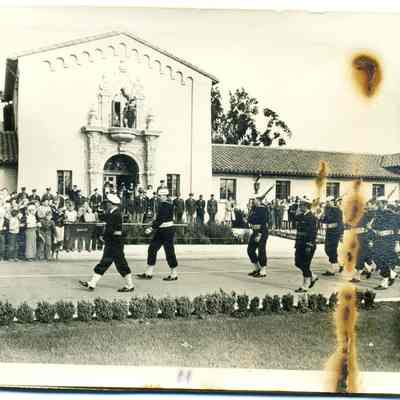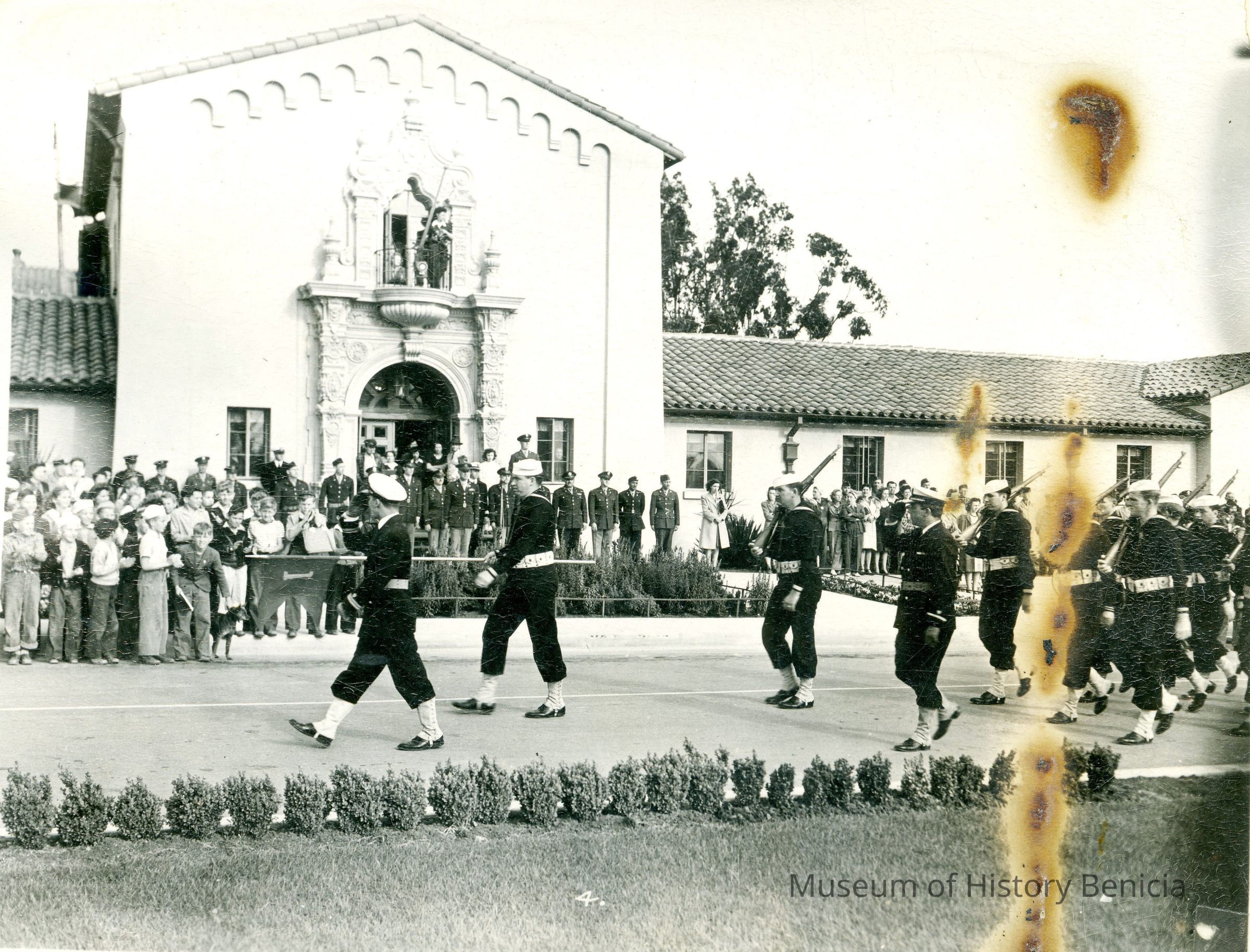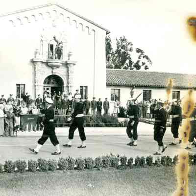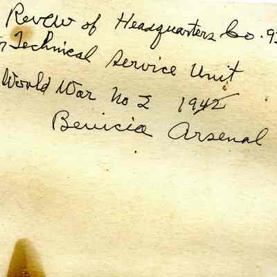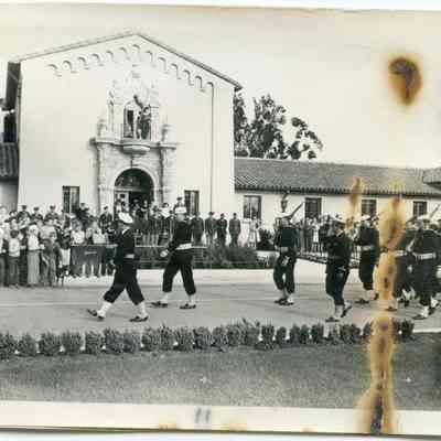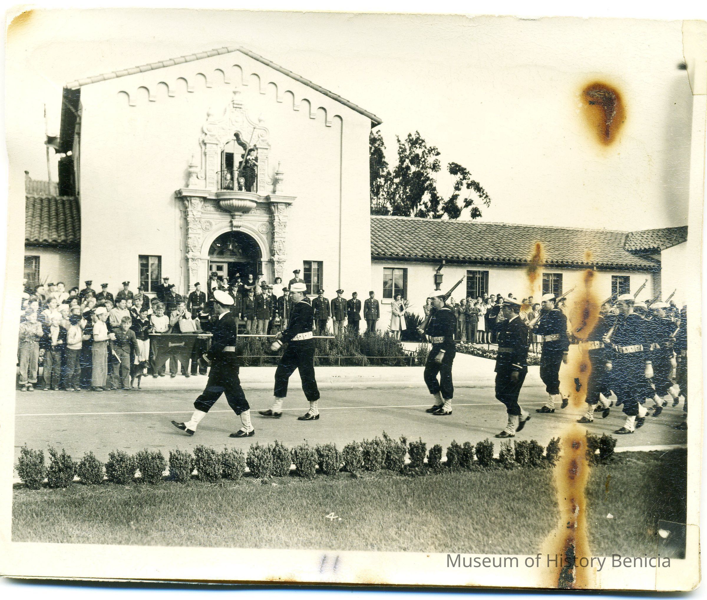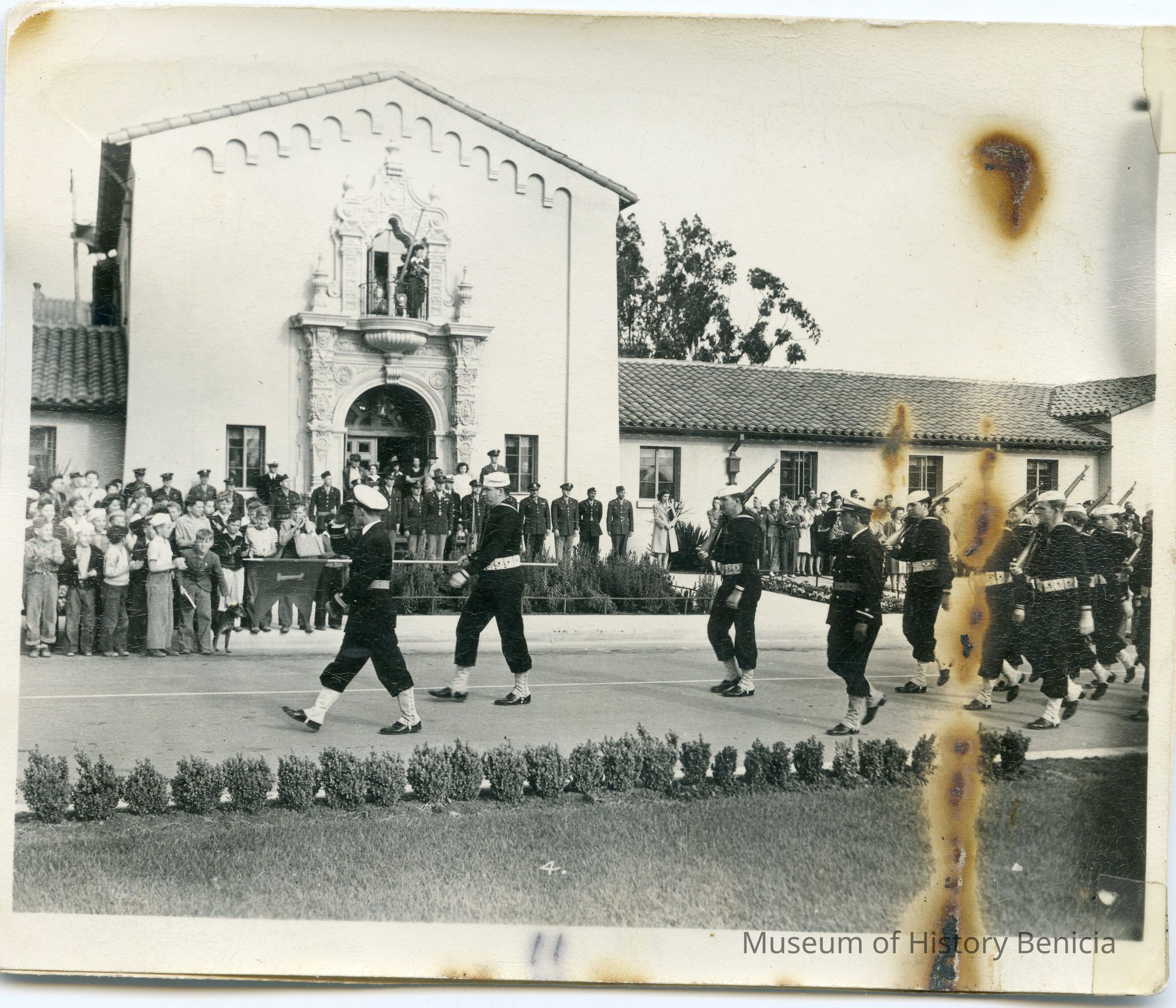This is a photo of U.S. Benicia Arsenal Headquarters Company 9307 (later the Technical Service Unit) on parade in front of the Arsenal Headquarters. The time period is WW II.