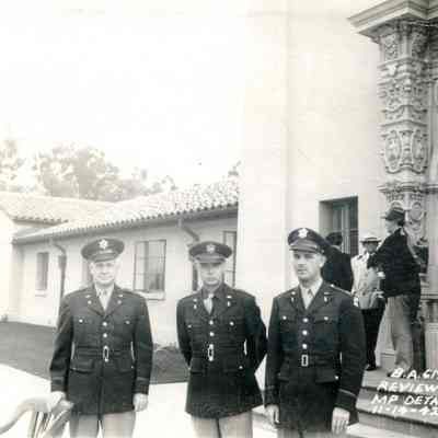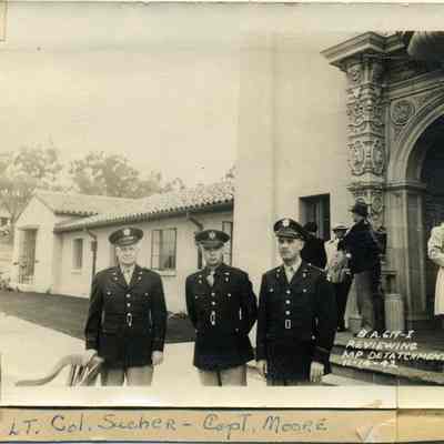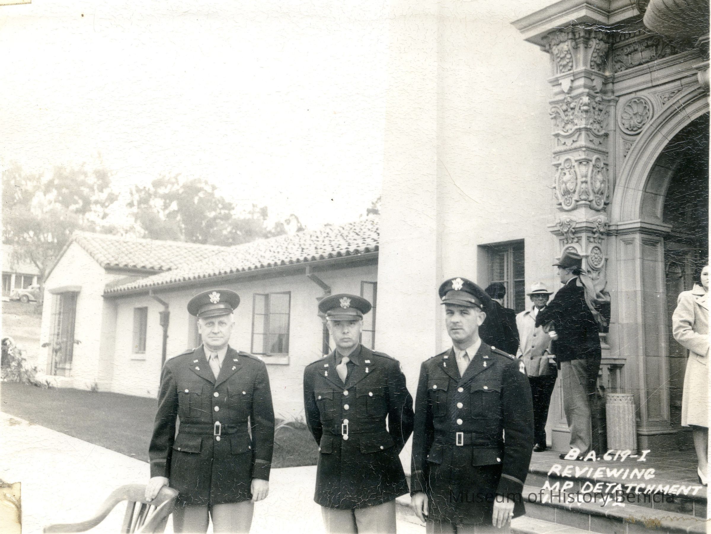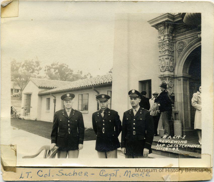 This is a photo of Lt. Col. Sucher and Capt. Moore in front on the Benicia Arsenal Headquarters building. The note on the photo says they are reviewing Military Police Detachment. The photo is glued to cardboard.Collection
