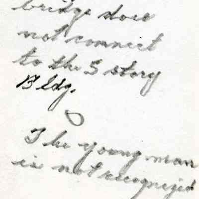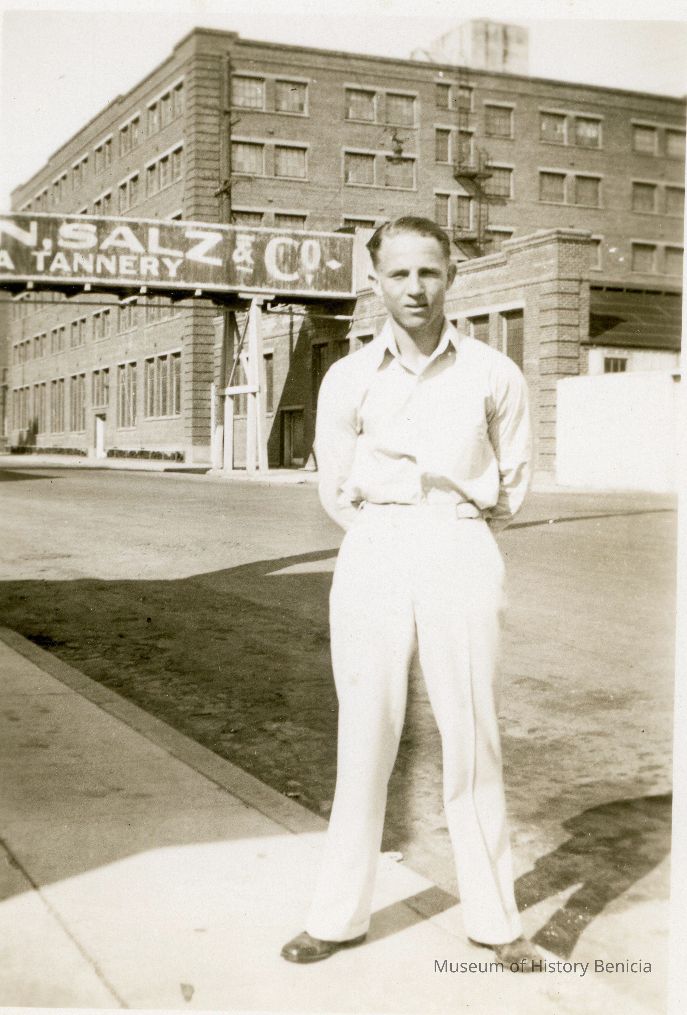 This is a photo of a man in front of the elevated walkway for the Kulman, Salz Tannery. It shows the bridge and the fact that it doesn't connect to the 5 story building close to it.Collection