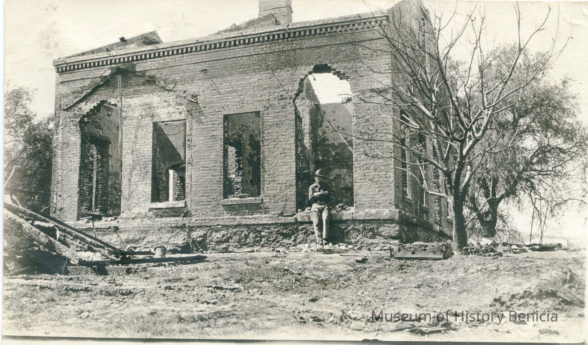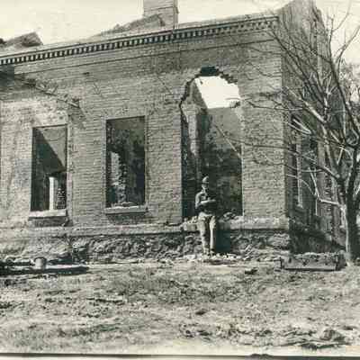 This is a photo of a soldier leaning against Magazine building #12 (a converted cistern) after it was partially destroyed in the 1922 Arsenal fire.Collection