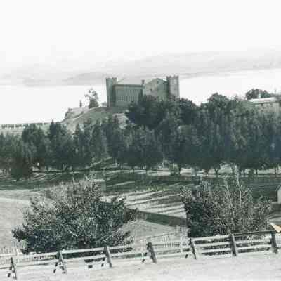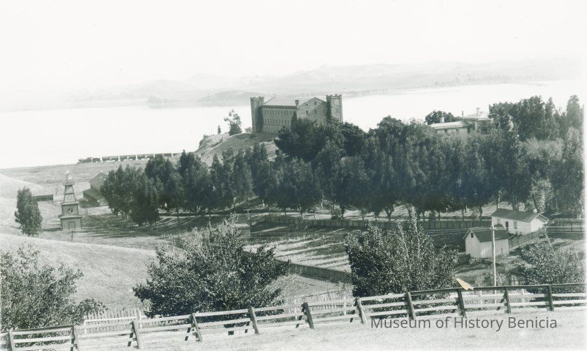 This is a photograph of the Clock Tower. This is building # 29 constructed in 1859. In this photo we see the building from a distance with the Carquinez Straits and Contra Costa county in the background. There is a small farm in the valley below the Clock Tower. There is also a tower in the valley. Not sure of the purpose but it could be a water tower.Collection