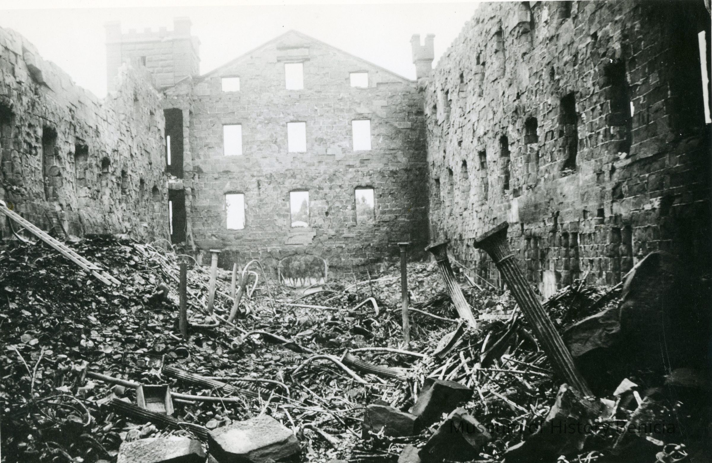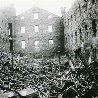 This is a photograph of the Clock Tower. This is building # 29 constructed in 1859. In this photo we see the building after the fire in 1912. It shows the interior full of rubble and twisted metal.Collection