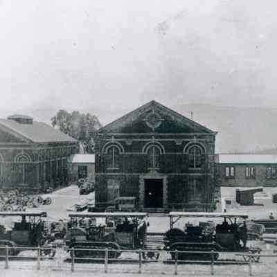 This is a photograph of buildings 55, 56 and 57 wow snow on the ground. There are "tracked" vehicles in front of the buildings. The car in front of the buildings looks about 1910/1920 vintage.