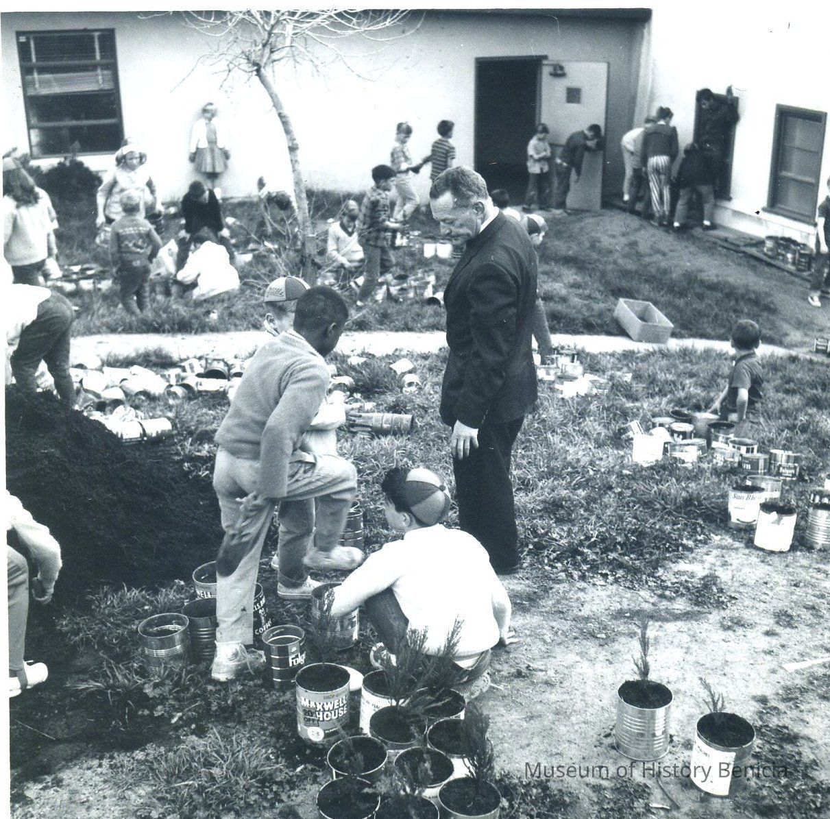 B/W photograph - Dr. Robert McKee (BUSD Superintendent from 1963-1970) with students at Mills Elementary School taking part in some type of school beautification project. It involved planting various types of vegetation is a side/rear section of the school grounds.