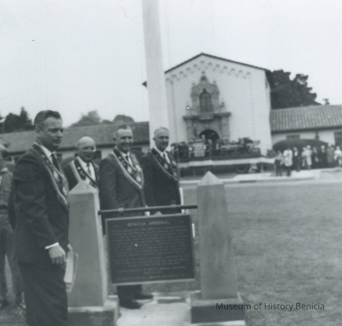 B/W photograph - Several men taking part in a ceremony for the installation of a plaque in the area near the flag pole in front of the Administration Building at the Benicia Arsenal.