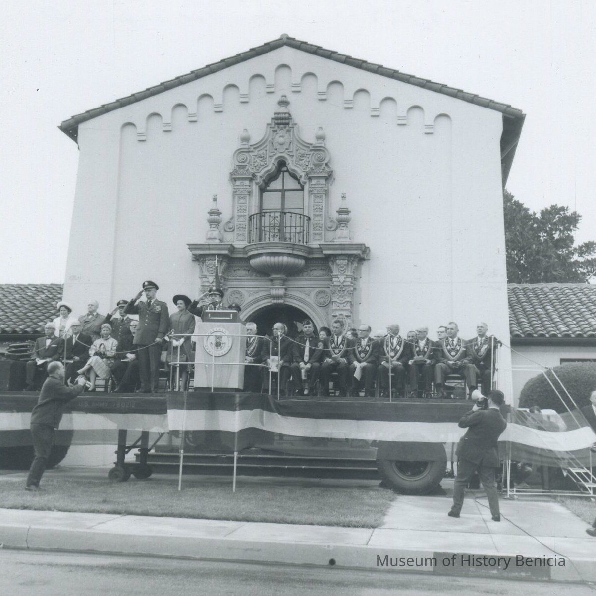 B/W photograph - A group of local dignataries are observing a ceremony in front of the Administration Building at the Benicia Arsenal. (date is unknown)