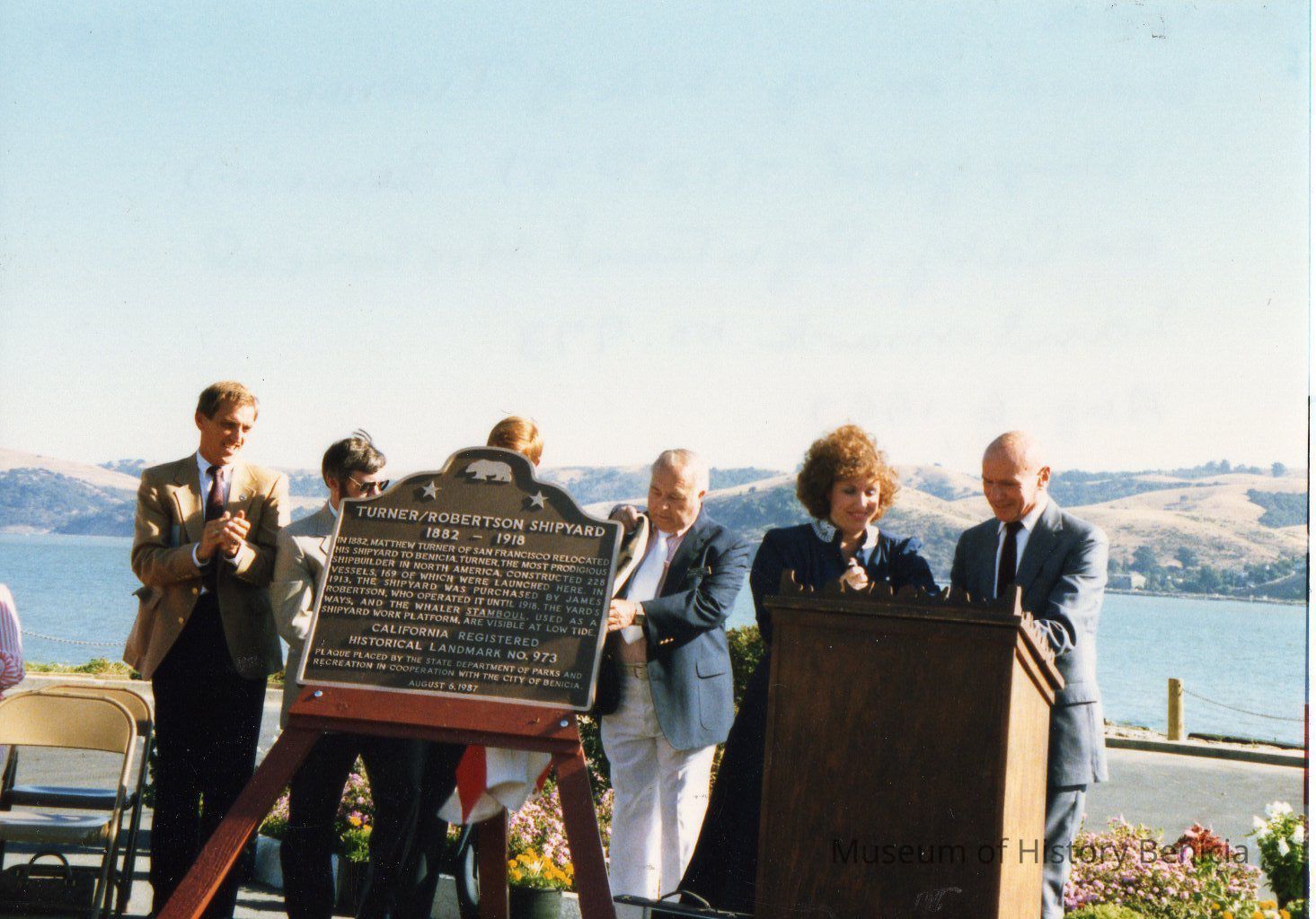 Dedication of site of Turner Shipyard (12th Street, Benicia) as California Registered Historical Landmark No. 973. L-R: Councilman Mike Roetzer, James Delgado, Councilman Ben Fuller, Richard Tipton, Mayor Marilyn O'Rourke, Dr. John Kimble, Chairman State Historical Resources Commission. Color film print, unmounted.Collection