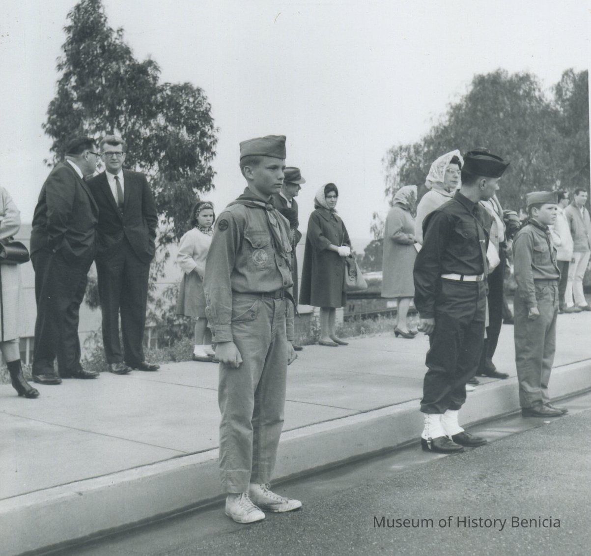 B/W photograph - Boy Scouts, the one in the front is believed to be Henry Henderson, at a ceremony in front of the Administration Building at the Benicia Arsenal. (date is unknown)