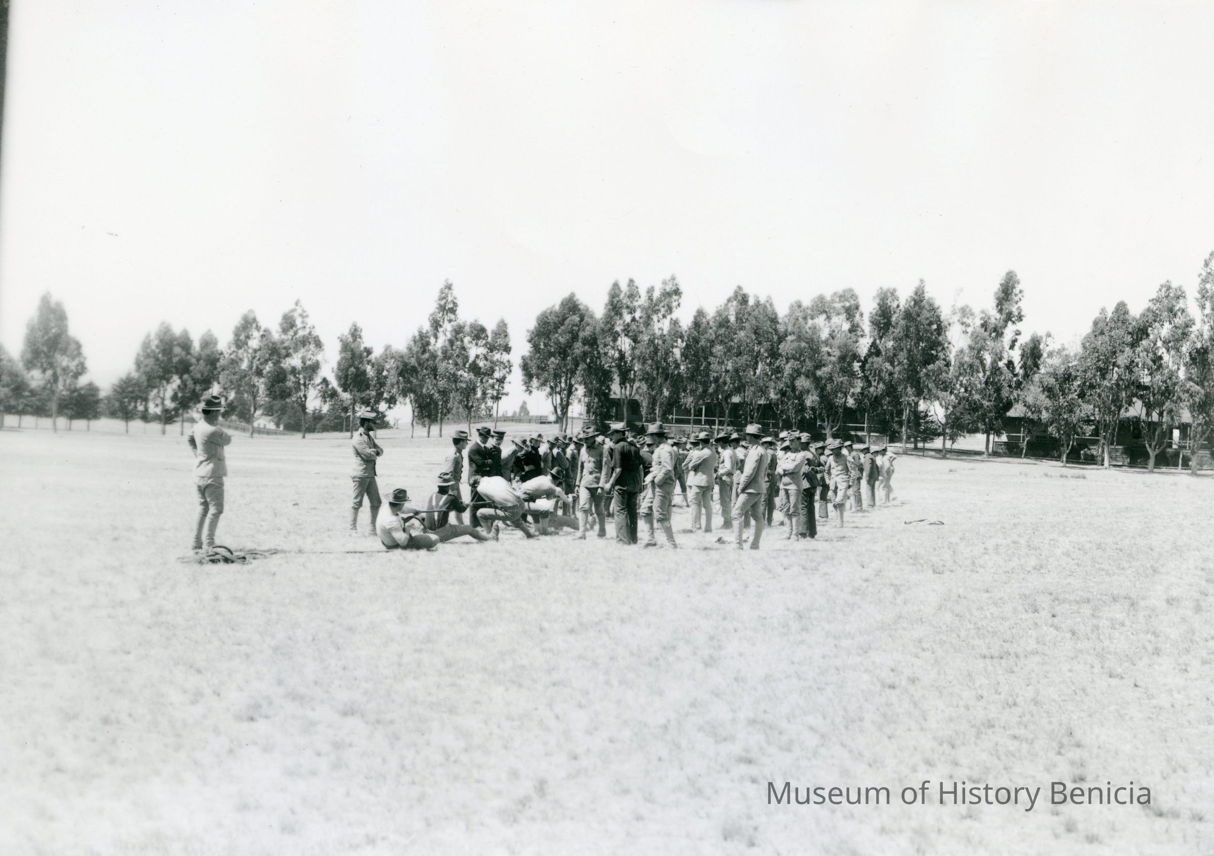 This is a copy photo of a tug-of-war contest by soldiers in front of the Benicia Barracks. It looks to be WW I.