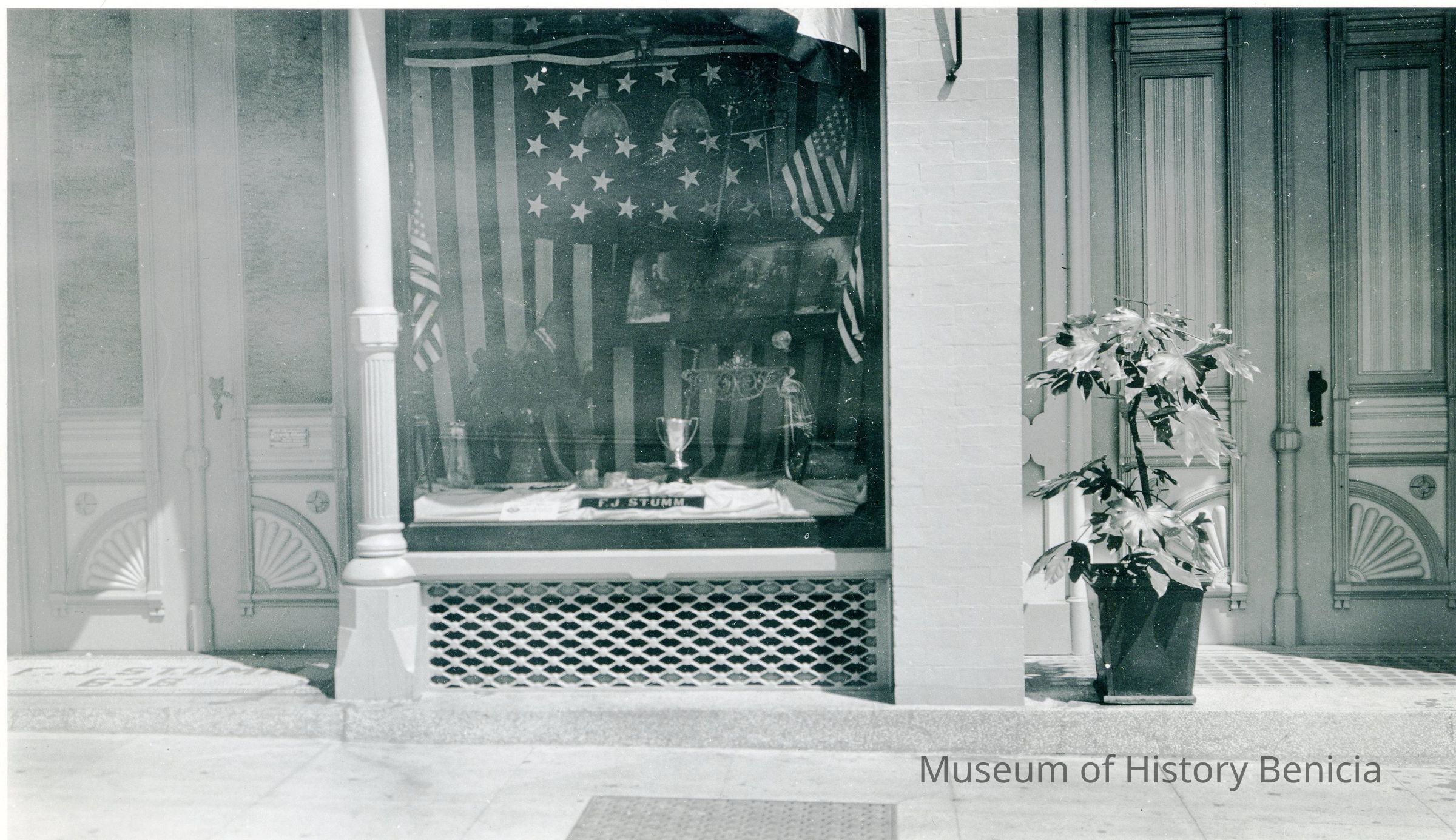 This is a photo of Frank Stumm's jewelry store on First Street. It shows an American flag, his name and a trophy in the window. There are some photos of Lincoln and Washington also in the window. In the front is a certificate of some sort.Collection