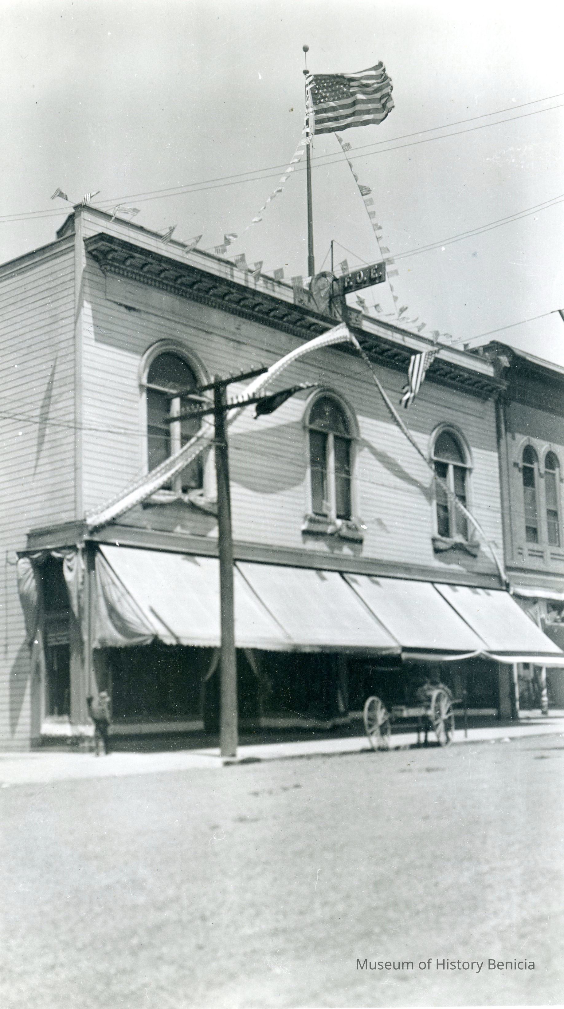 This is a photo of the U.P.E.C. Hall in Benicia. There is a sign with F.O.E. under the flag pole and a horse and wagon in front. There is a benicia Library stamp on the back.Collection