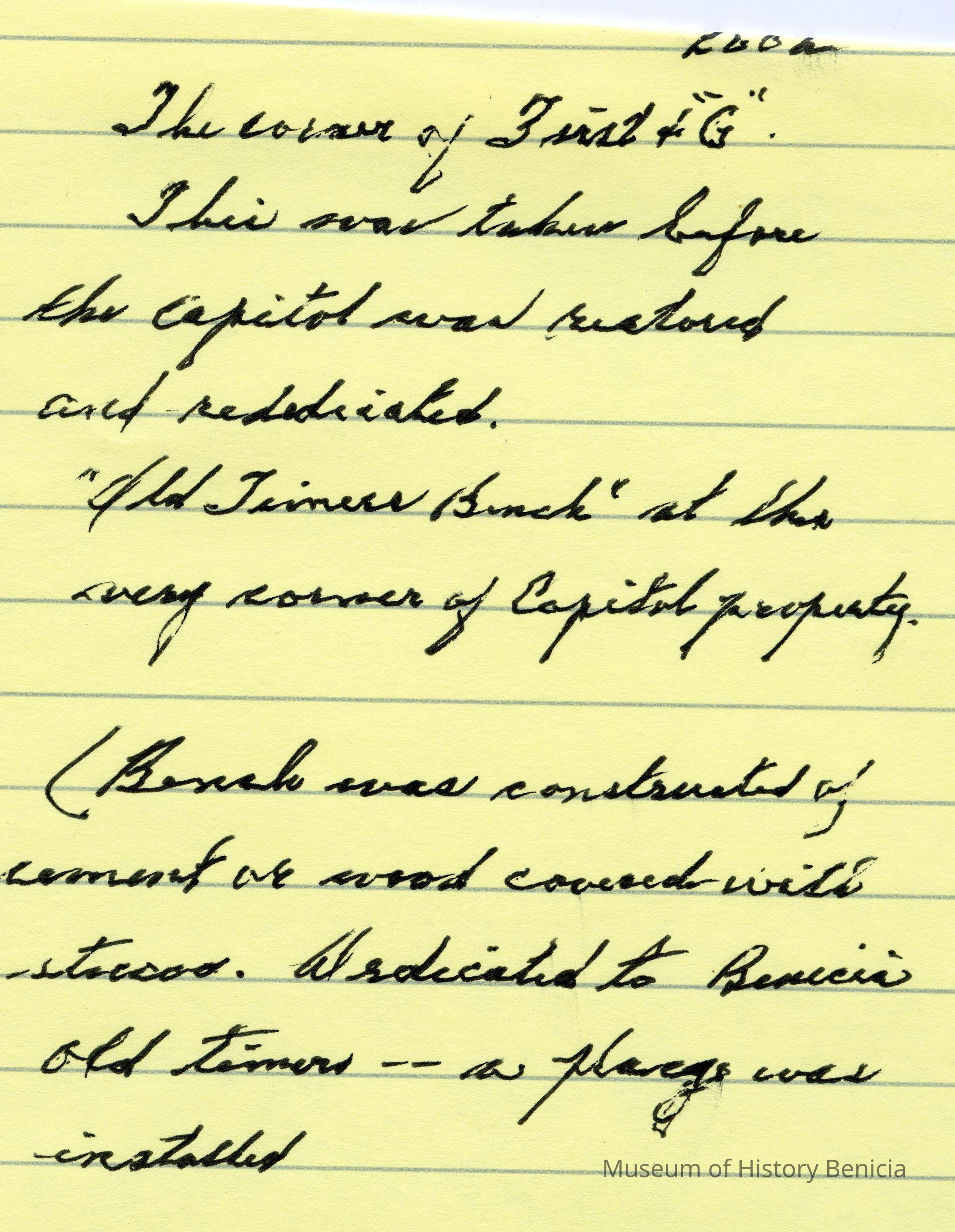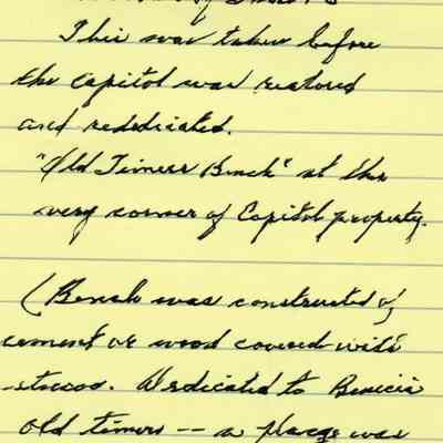 This is a photo of the old State Capitol at First and G street. It was taken before the Capitol was restored and rededicated. There is a bench on the right side of the photo that was dedicated to the "Old Timers". There was a placque made for it.Collection