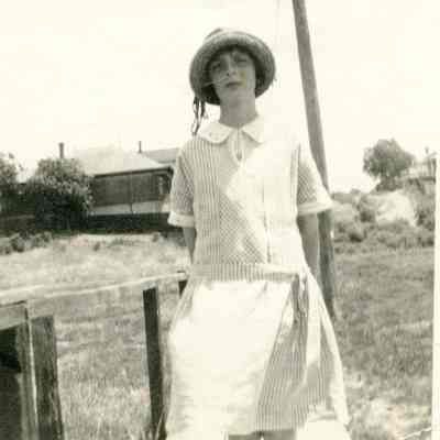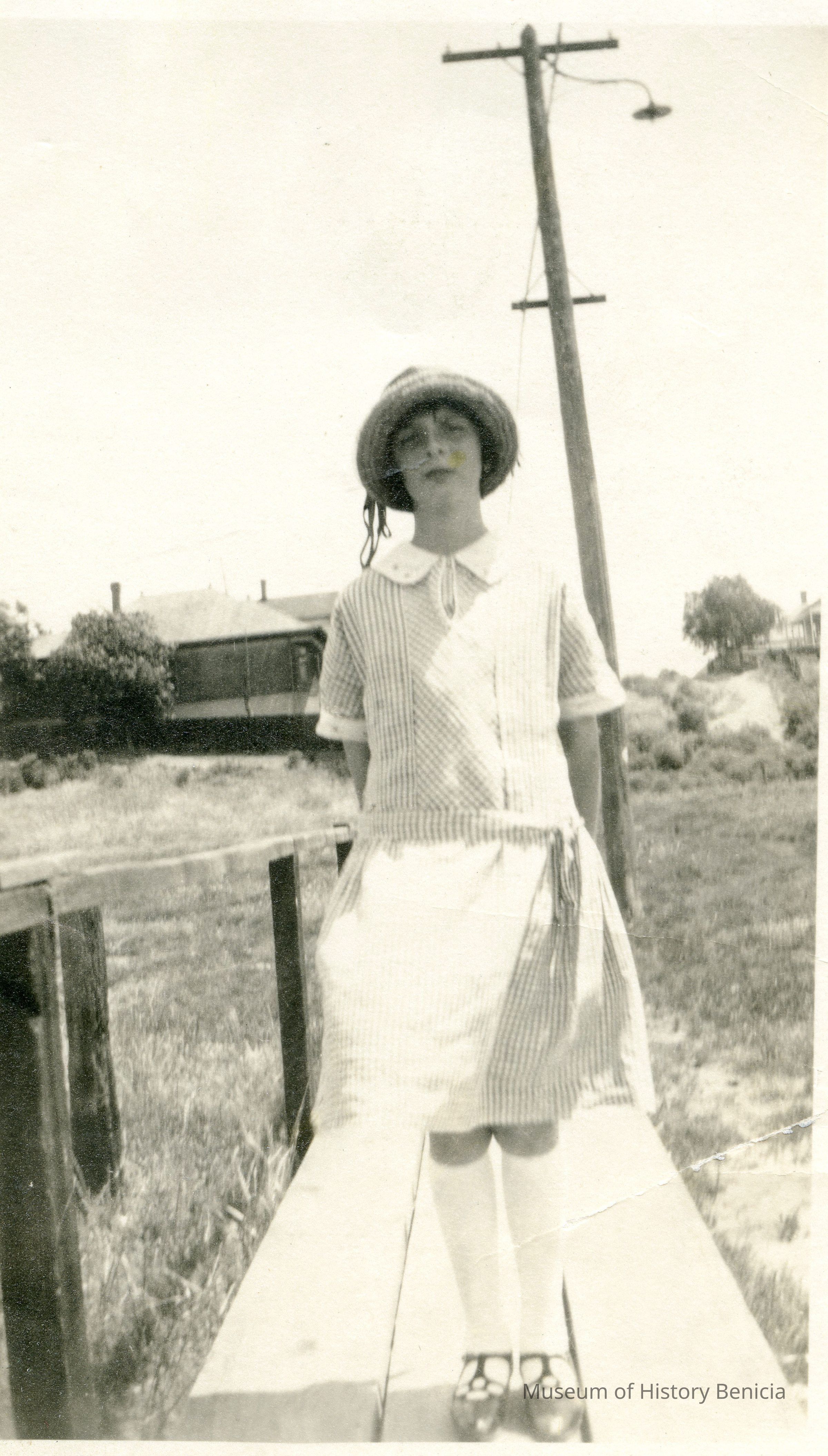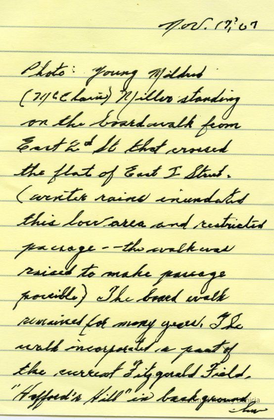 This is a photo of Mildred (McClain) Miller standing on the boardwalk from East 2nd St. that crossed the flats of East I street. The walk incorporated a part of Fitzgerald Field. "Hafford's Hill" is in the background of the photo.Collection