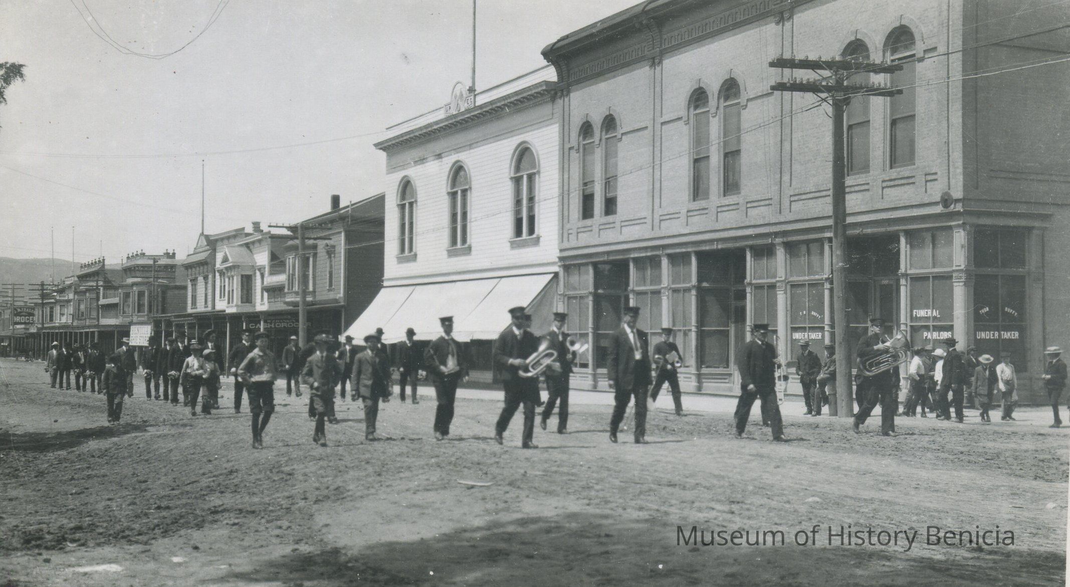 B/W photograph - a band marching on First Street Benicia at the intersection with "J" Street; on the corner in the background is an undertaker's (Thomas Duffy) parlor on the ground floor of the Masonic Building; 3-1/2" x 5-3/4"Collection