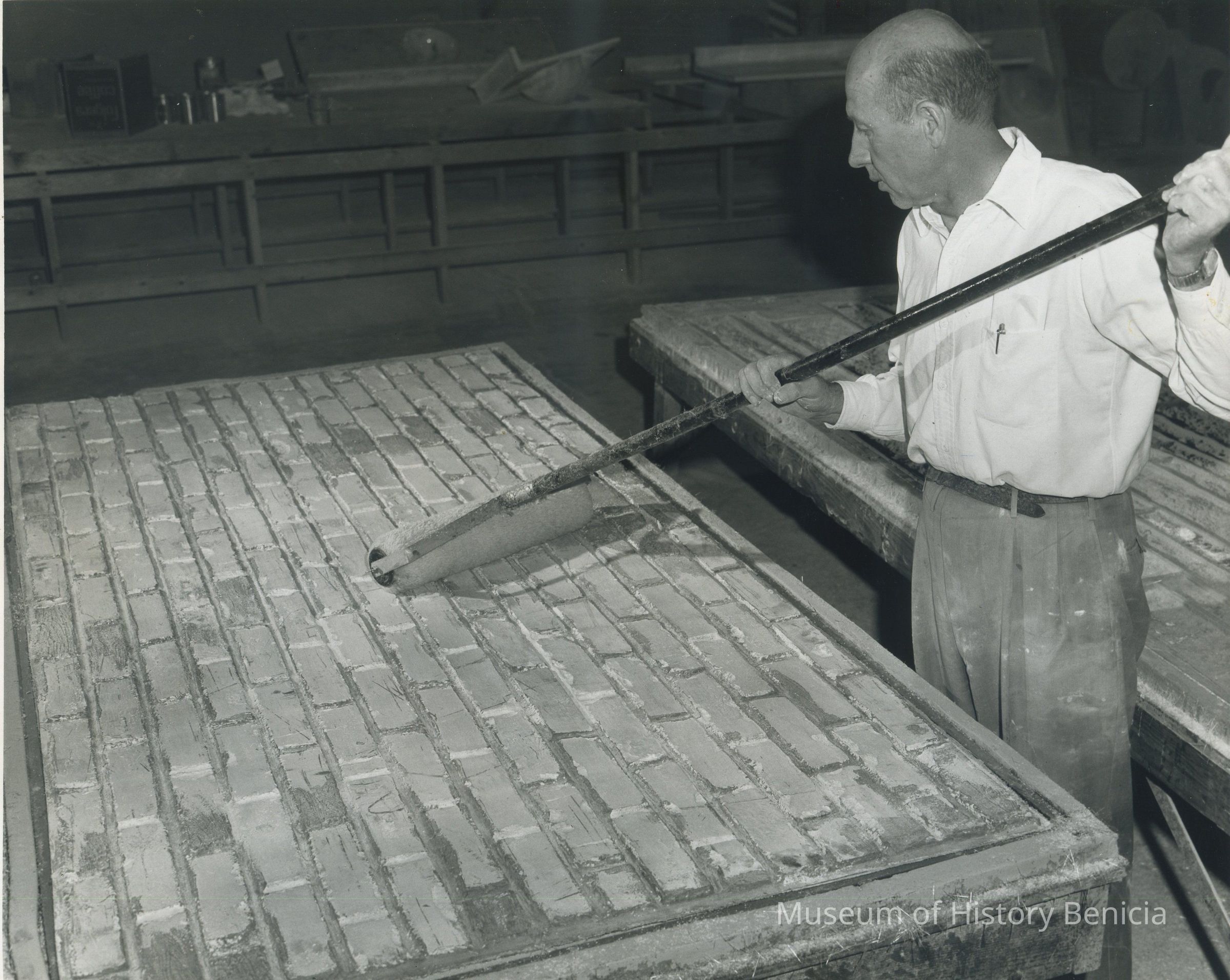 B/W Photograph 8" x 10" - A construction worker preparing a panel for the Benicia Capitol Building Restoration Project.