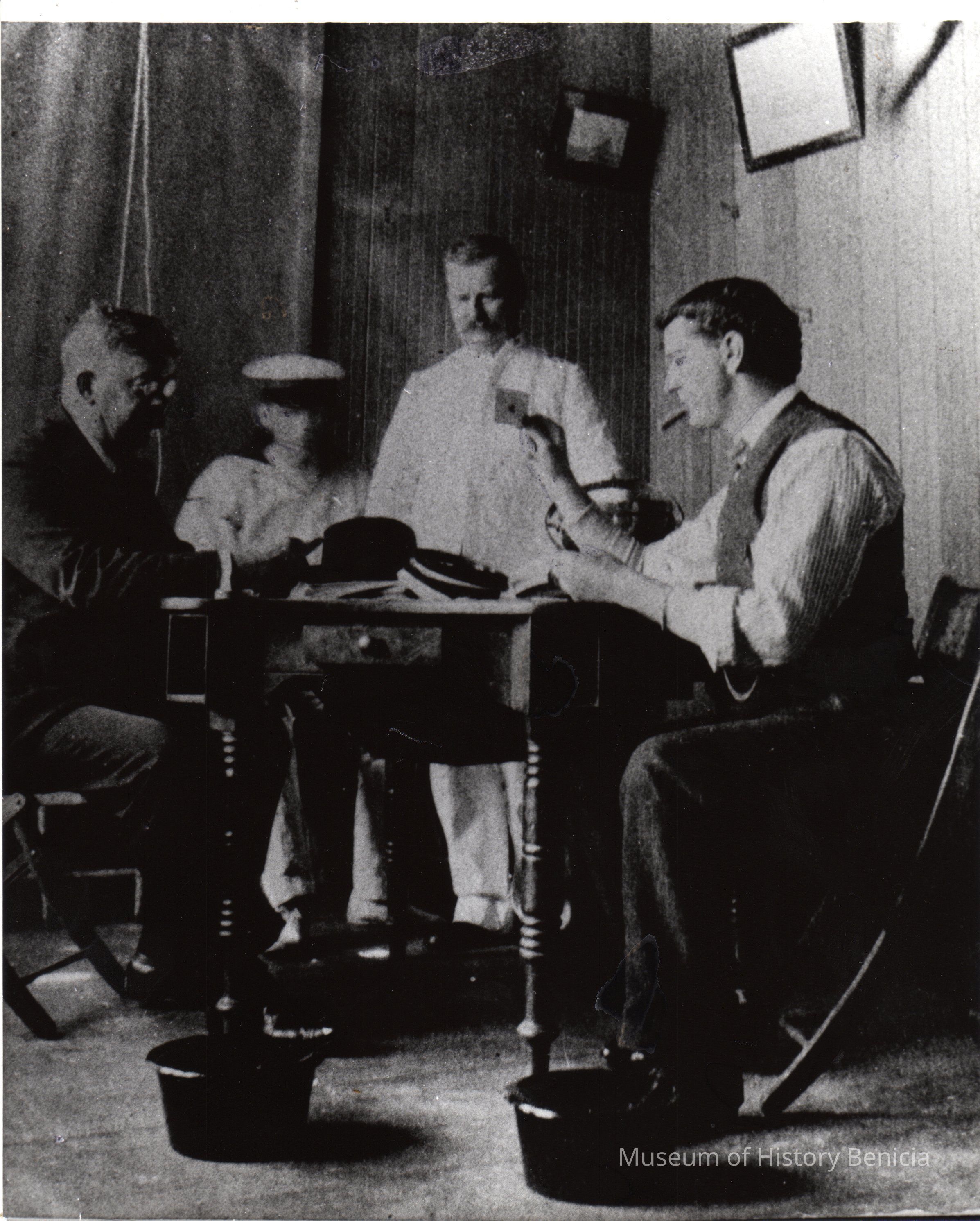 Jack London playing cards at Vallejo Yacht Club, 1913. L/R: George Hilton, unknown, Judge John Brown, Jack London (playing his "ace"). Black and white.