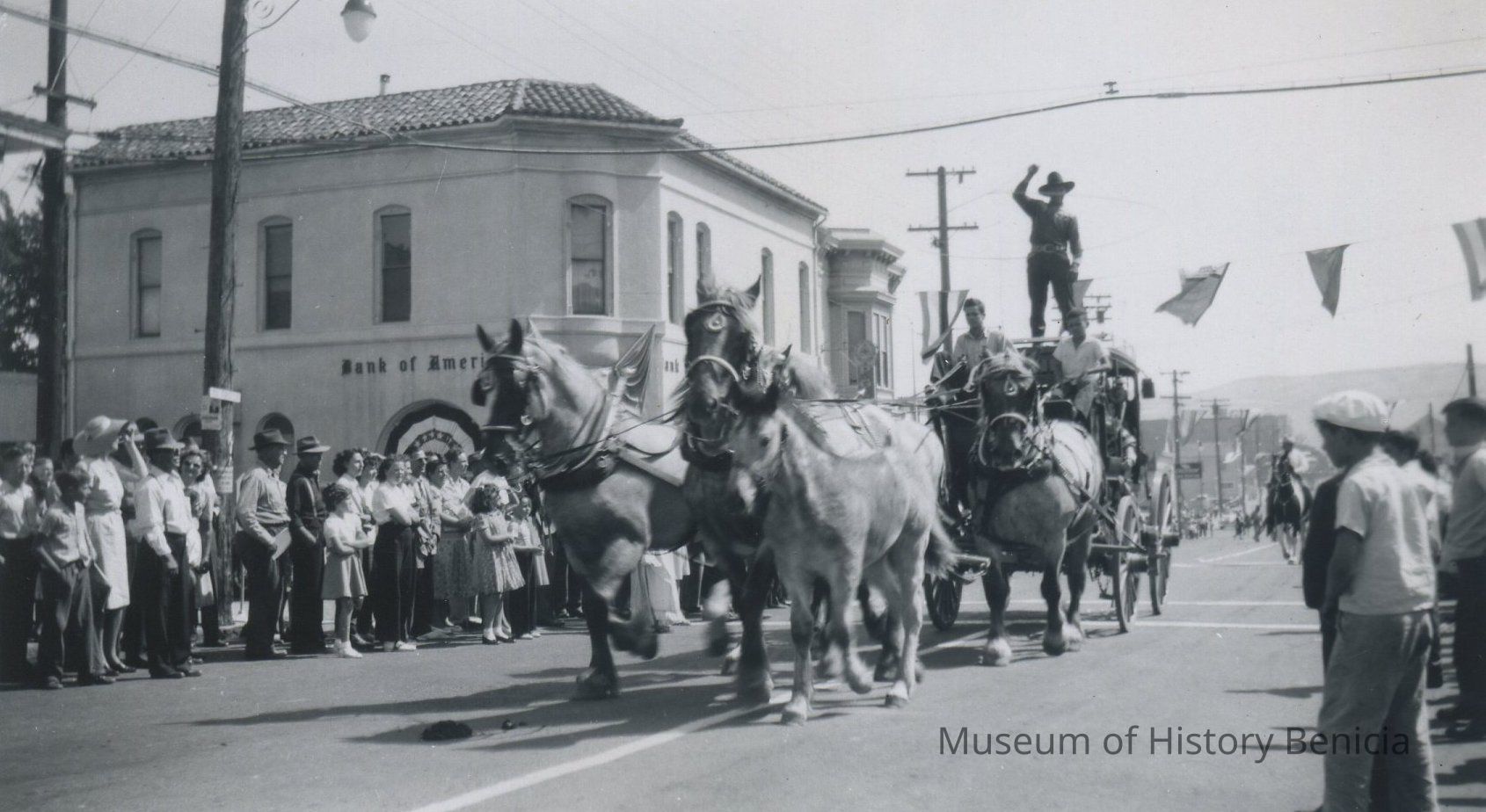 B/W Photograph - Parade on First Street; a horse-drawn stage coach takes part in the parade. That day the State Theater was showing the movie, "The Dark Mirror", which was released in 1946. So, it is likely this parade took place in 1948 during the Old Timers' Celebration;