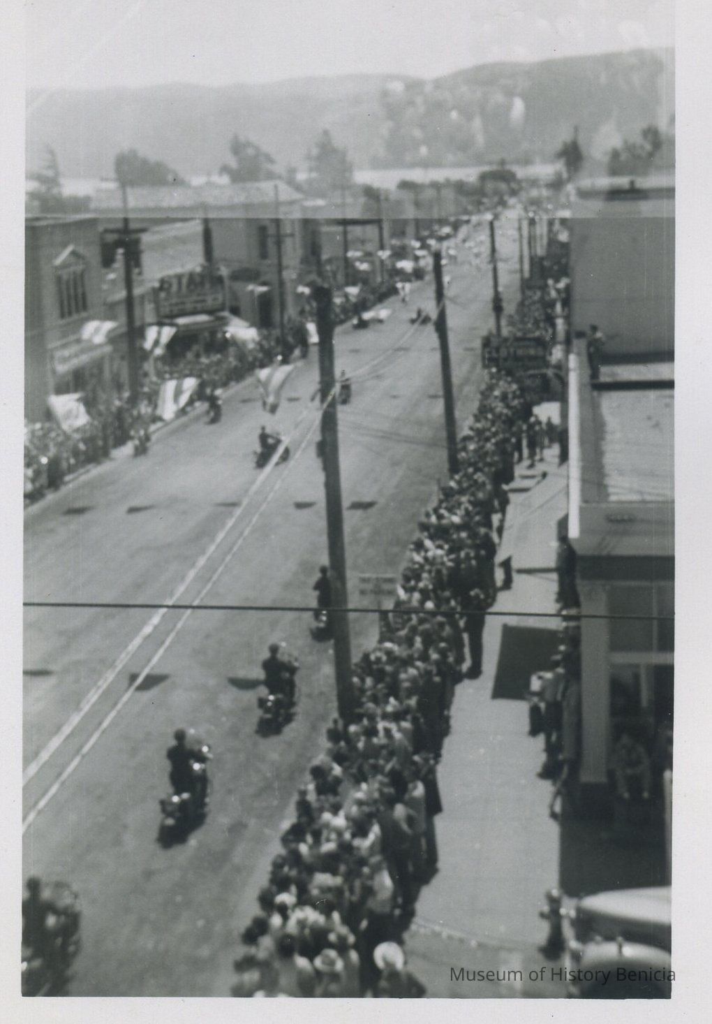 B/W Photograph - Parade on First Street; a view of the parade (time period unknown) from a roof top at the NW corner of the intersection of First and H Streets; a motorcycle drill team is performing a routine.